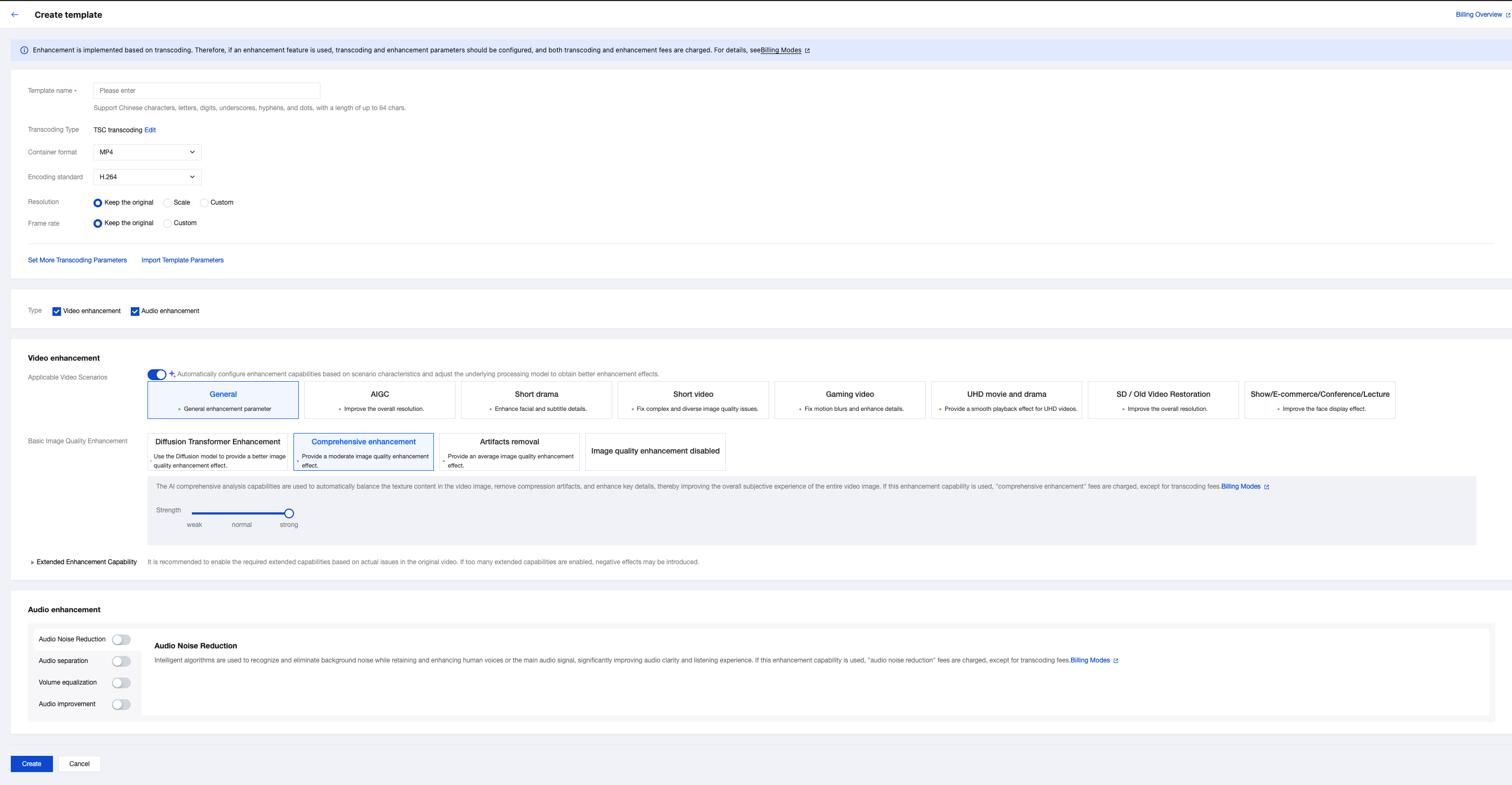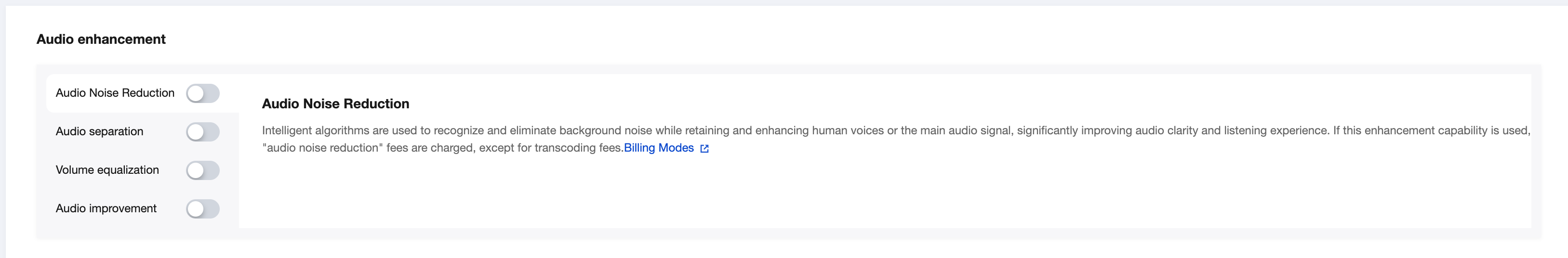 Audio Beautification | Intelligent audio beautification removes noise, suppresses unnatural sibilant sounds, and improves audio quality. | When using this enhanced capability, in addition to the transcoding fee, you will also be charged for "audio beautification". |