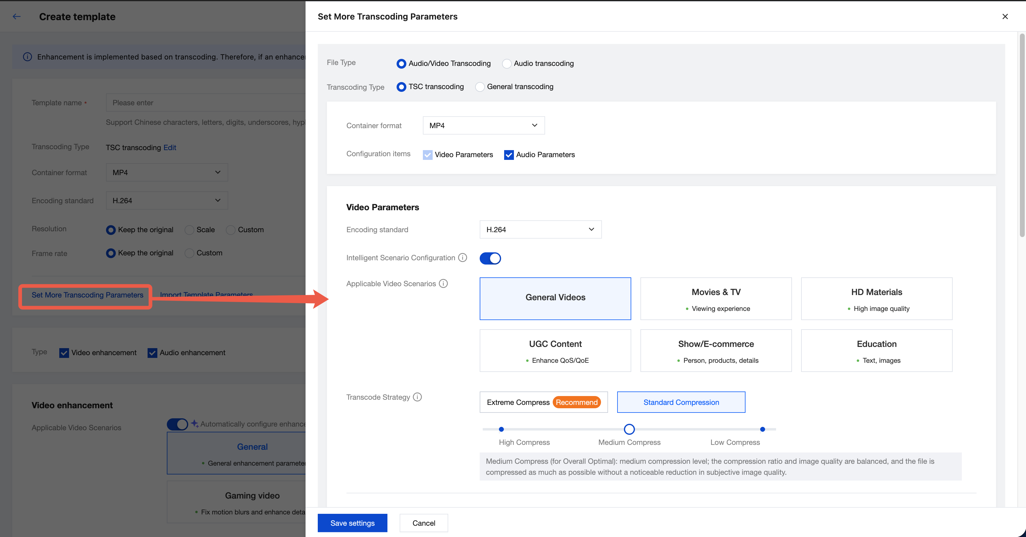 Click More Transcoding Parameter Settings to configure complete transcoding parameters in the pop-up interface on the right. For detailed transcoding parameter explanations, refer to Audio/Video Transcoding Template.