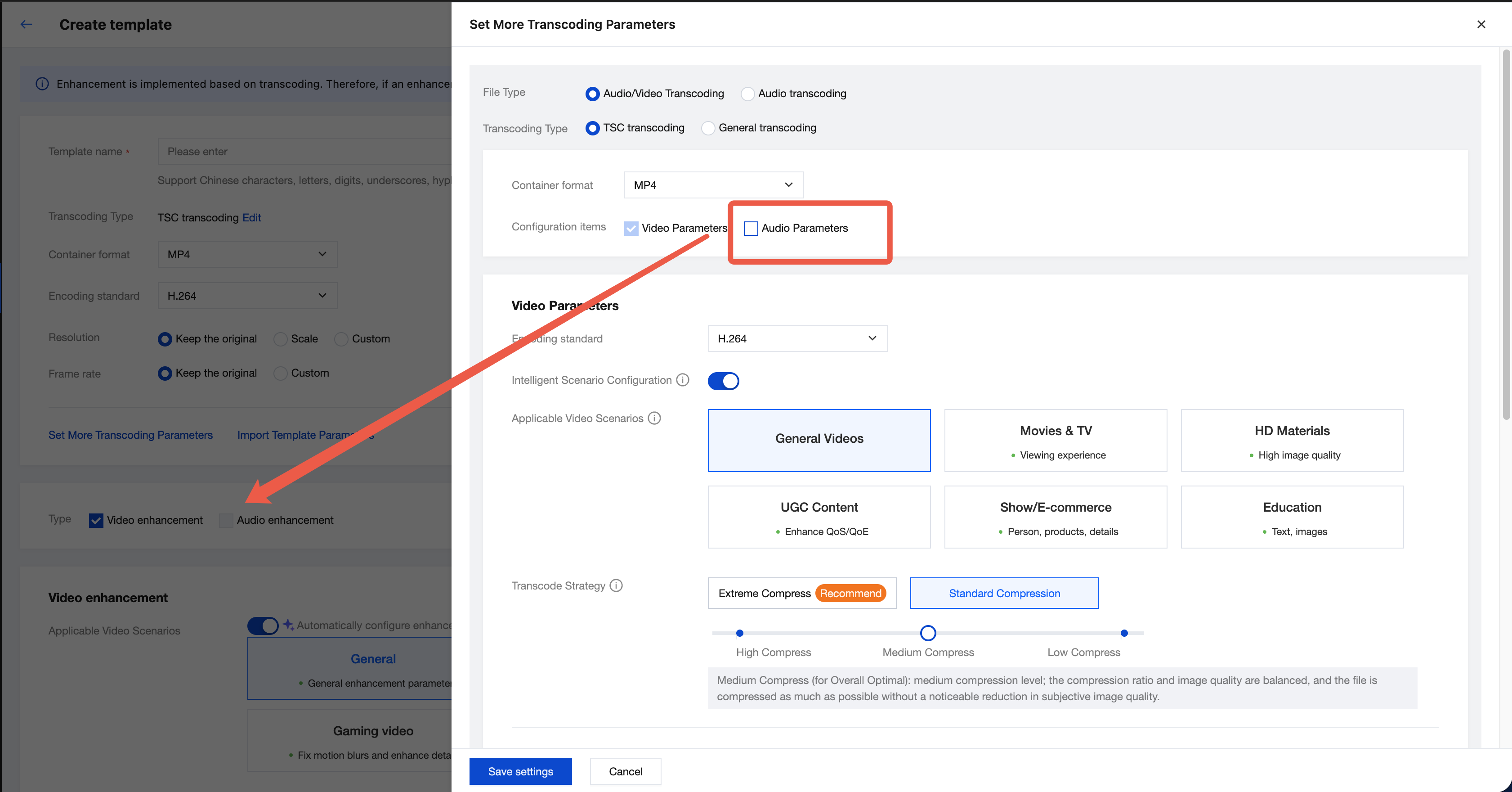 When selecting the "audio and video transcoding" data type, video enhancement and audio enhancement features can be enabled.