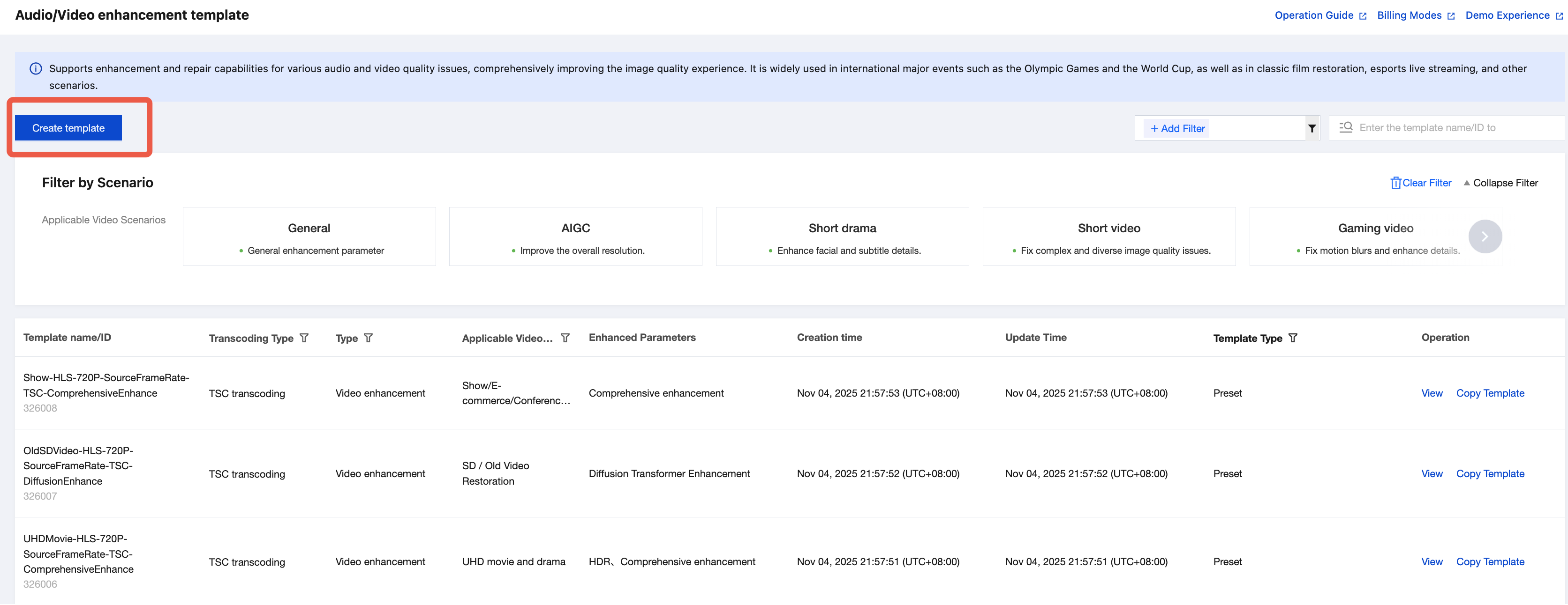The system offers a selection of preset enhancement templates for your convenience. Additionally, you can create custom templates tailored to your specific business needs. By setting different processing parameters for various application scenarios, these templates facilitate easy reuse in future projects. The following provides a detailed explanation on how to create custom audio/video enhancement templates using the console and API.