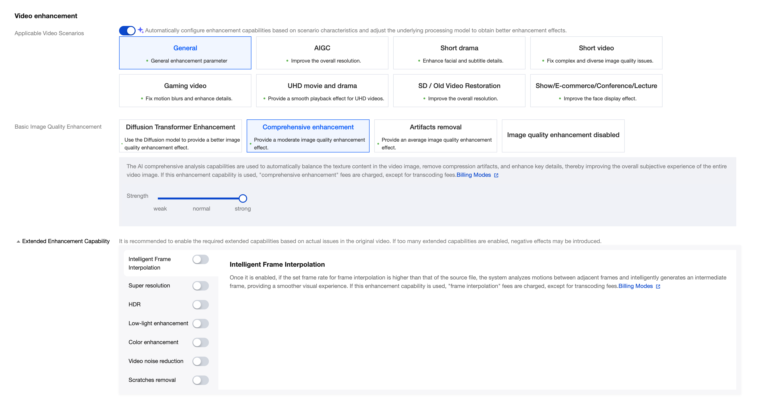 Applicable Video Scenarios | | We have preset recommended parameters for scenarios such as AIGC, mini-drama, short video, gaming video, and HD TV shows and movies. Click different scenarios, and MPS will automatically configure enhanced capabilities for you, adjust the underlying processing model, to obtain better enhancement effects. You can also fine-tune on the basis of recommended parameters. | - |