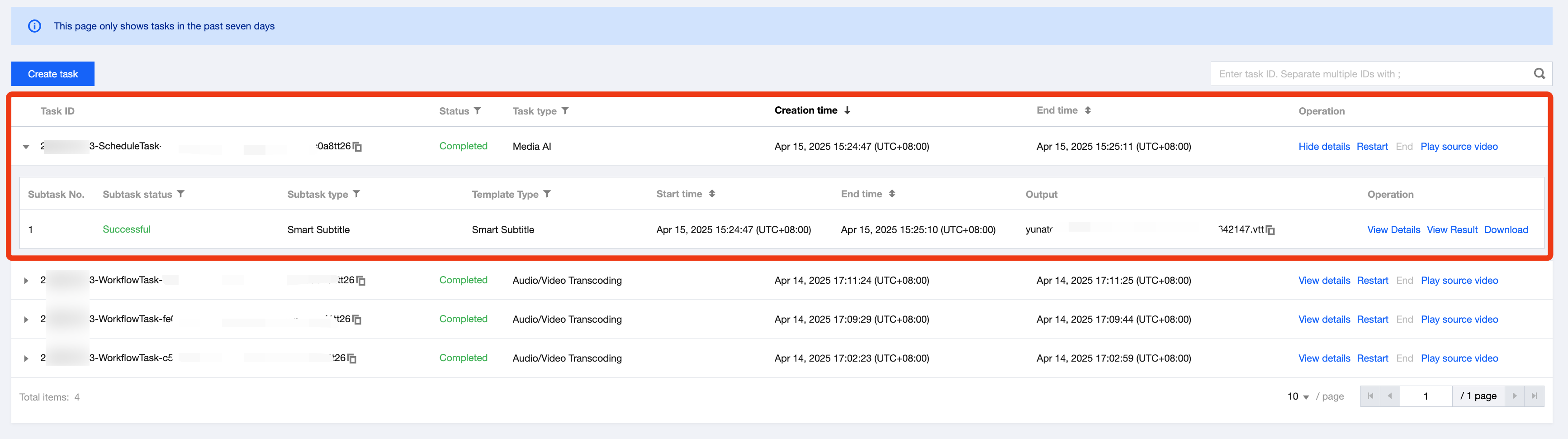 Call the DescribeTaskDetail API and fill in the task ID (for example, 24000022-WorkflowTask-b20a8exxxxxxx1tt110253 or 24000022-ScheduleTask-774f101xxxxxxx1tt110253) to query task results. Example: