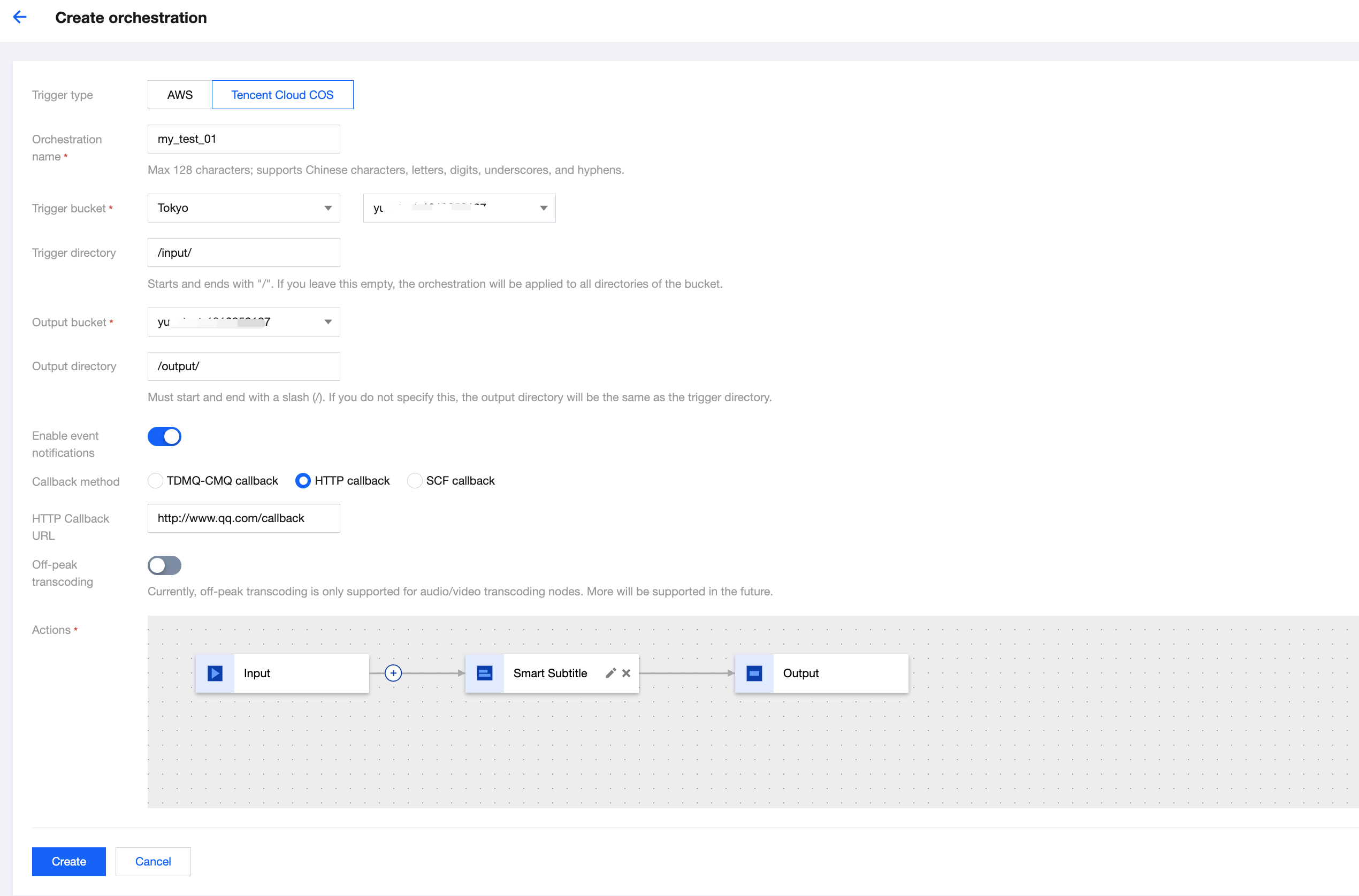 1. Enter On-demand Orchestration in the menu, click Create VDD Orchestration, select the smart subtitle node in task configuration, and configure parameters such as the bucket and directory to be triggered.