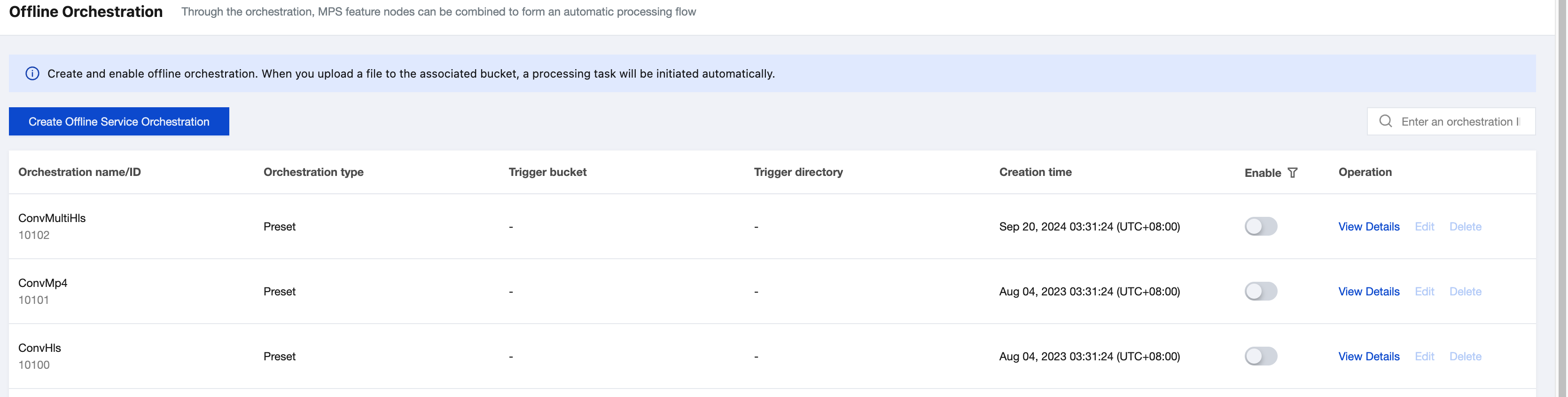 If the orchestration is disabled, MPS tasks will not be executed for video files uploaded to the trigger bucket.