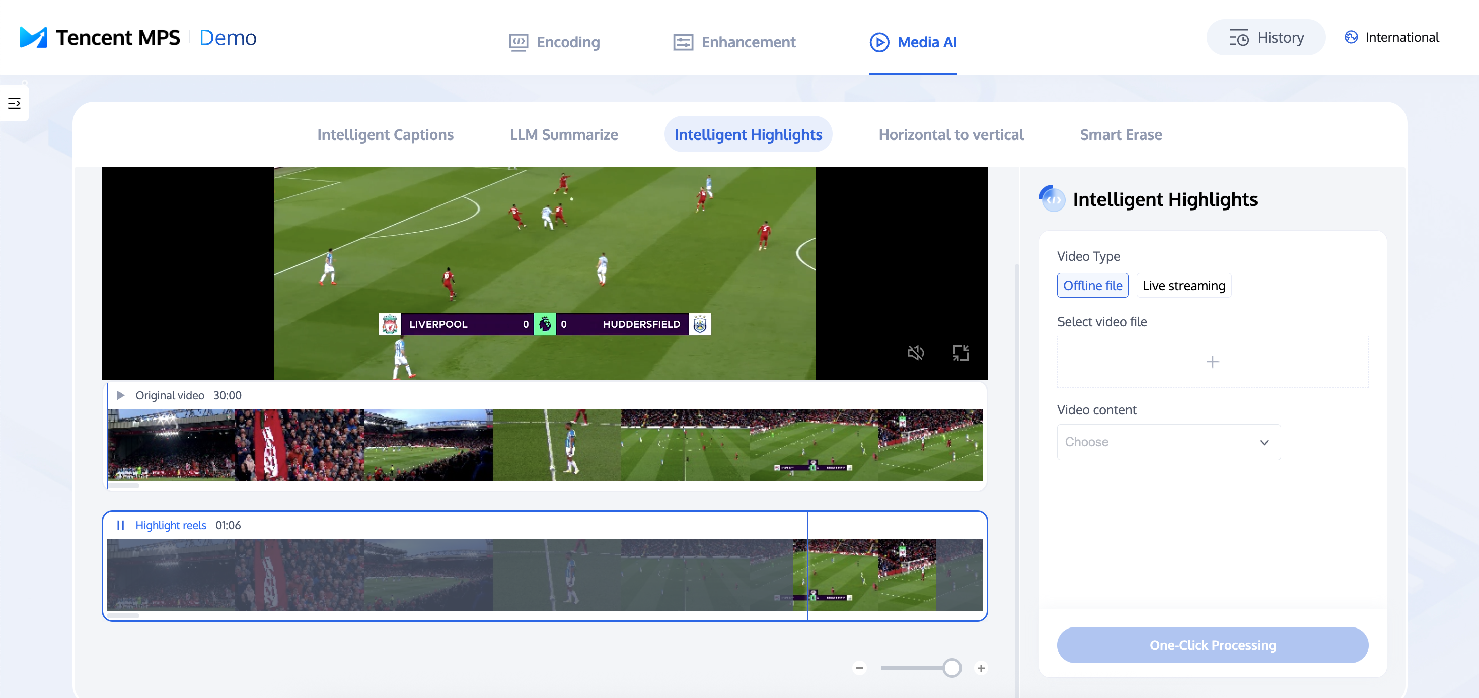 1. Access the Experience Center to navigate to the Intelligent Highlights page. On the right side, select either an offline video file or a live stream, specify the video content category, and click One-Click Processing.
