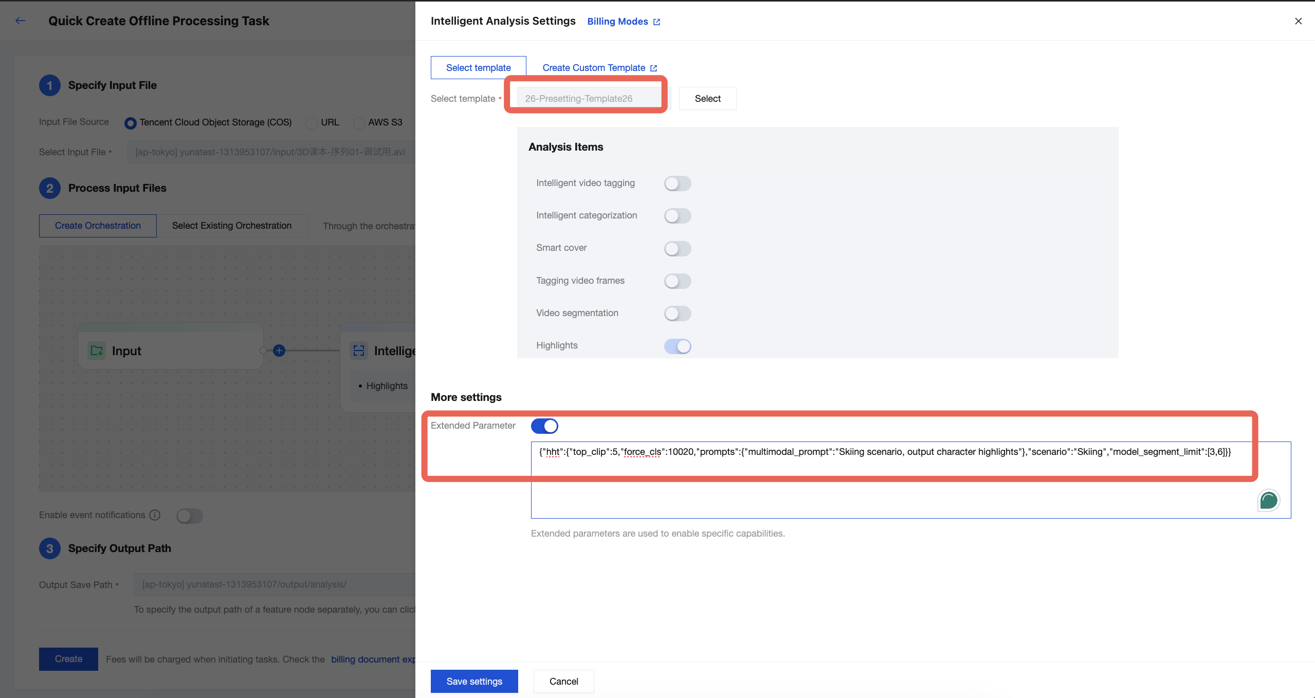 In the Intelligent Analysis Settings drawer that appears, select the Intelligent Highlights preset template (template ID: 26). You can enable Extended Parameters under More Settings and pass extended parameters as described in this documentation to specify a highlight scenario and achieve better highlights.