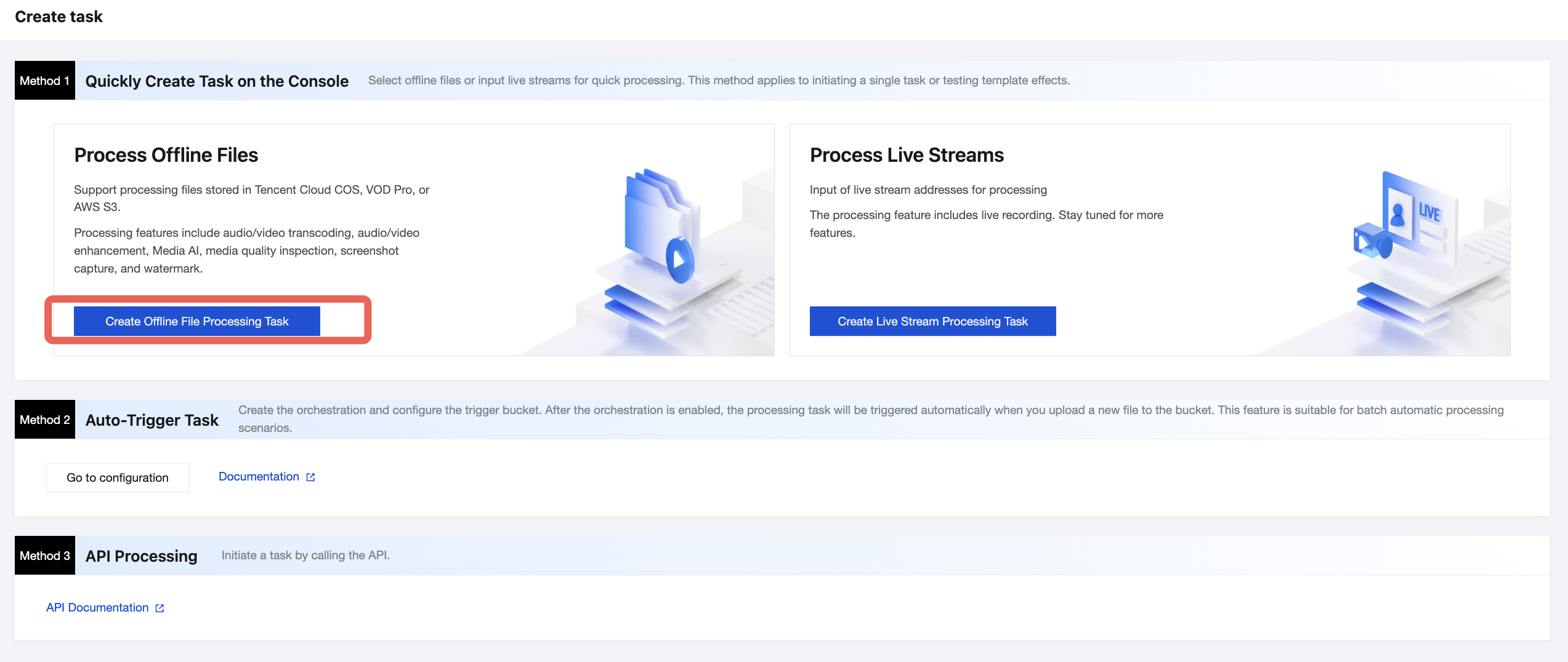 1. Go to the MPS console and click Create Task > Create Offline File Processing Task.