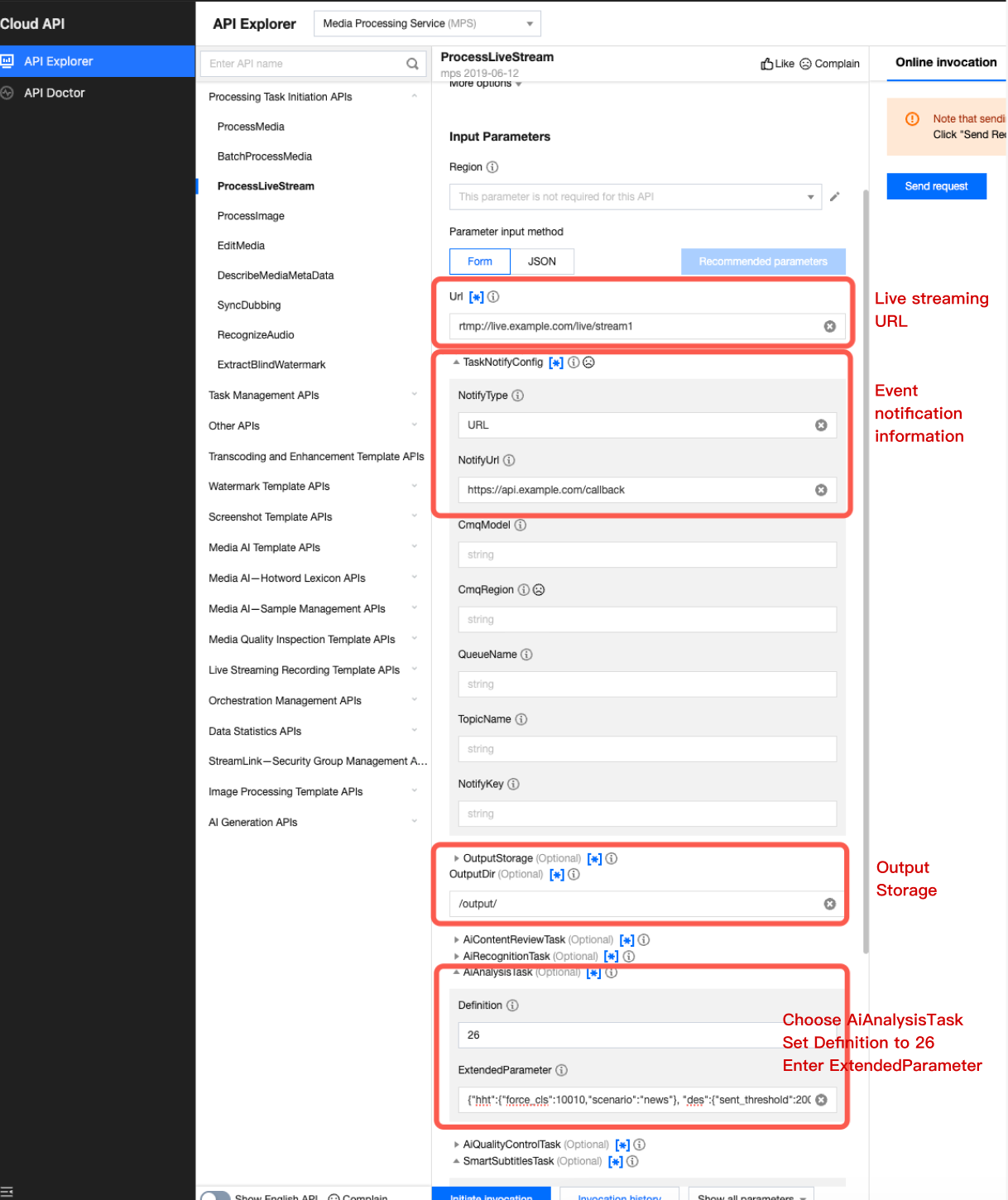 For details on calling an API to initiate a live stream processing task, see ProcessLiveStream. In the document, click API Explorer Debugging in the description to go to the page, fill in the required parameters, and initiate an online call.