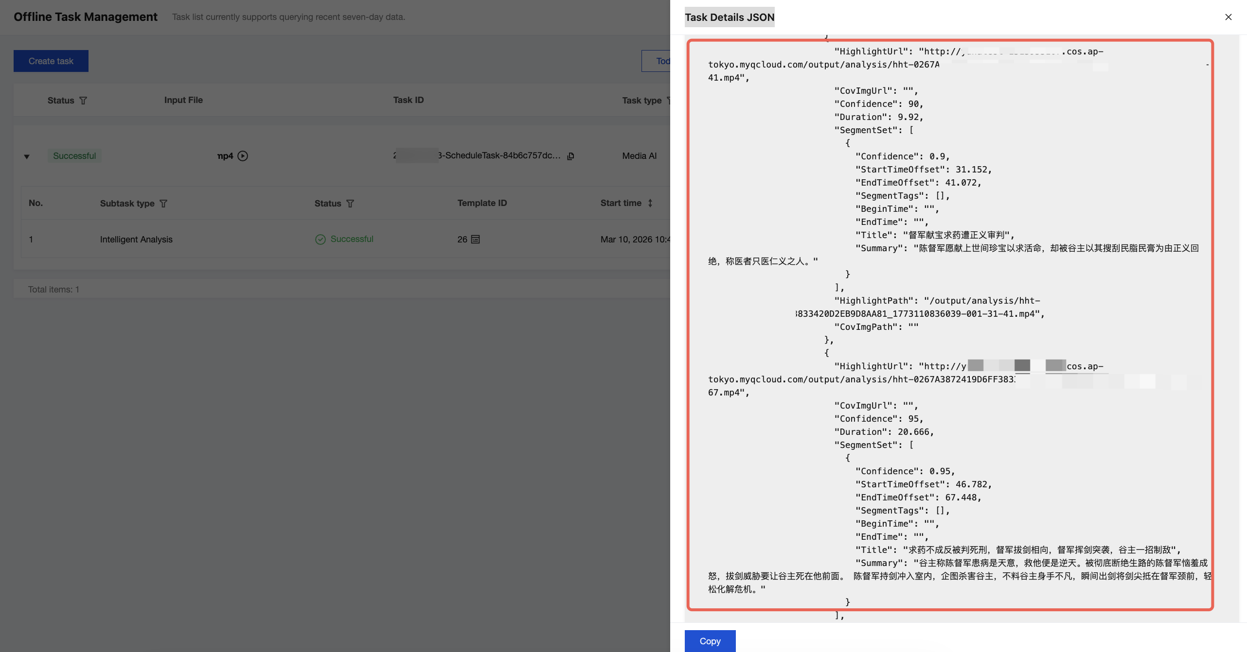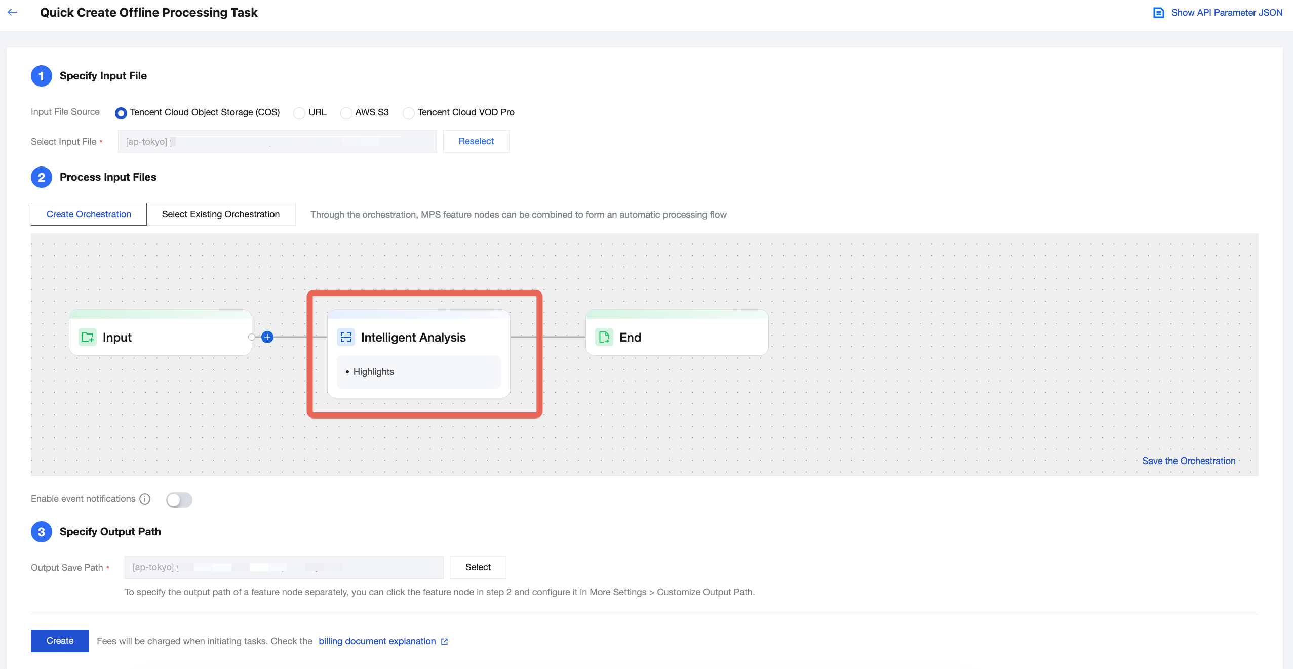 Initiating a task from the console requires a preset template (preset intelligent highlights parameters). Due to some special parameters in the highlights that cannot be configured in the template, it may affect the effect of the Intelligent Highlights. Therefore, it is recommended to use the API integration.