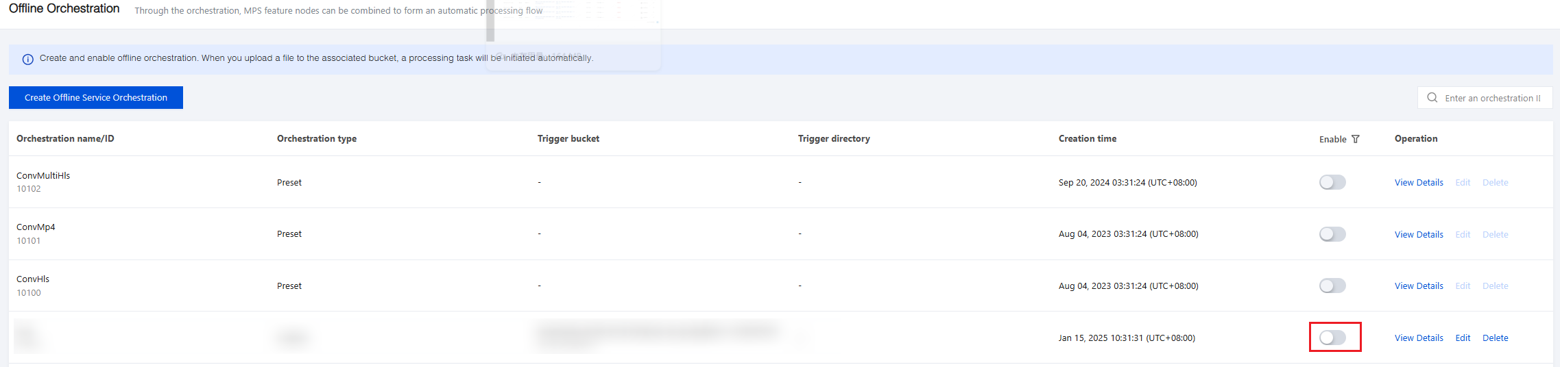 2. Then, go to the Offline Orchestration, find the newly created orchestration, and enable it by clicking the Enable button. As for the subsequent new video files in the Trigger Directory, tasks will be automatically triggered according to the preset process and parameters in the orchestration, and the processed video files will be saved to the output path configured by the orchestration.