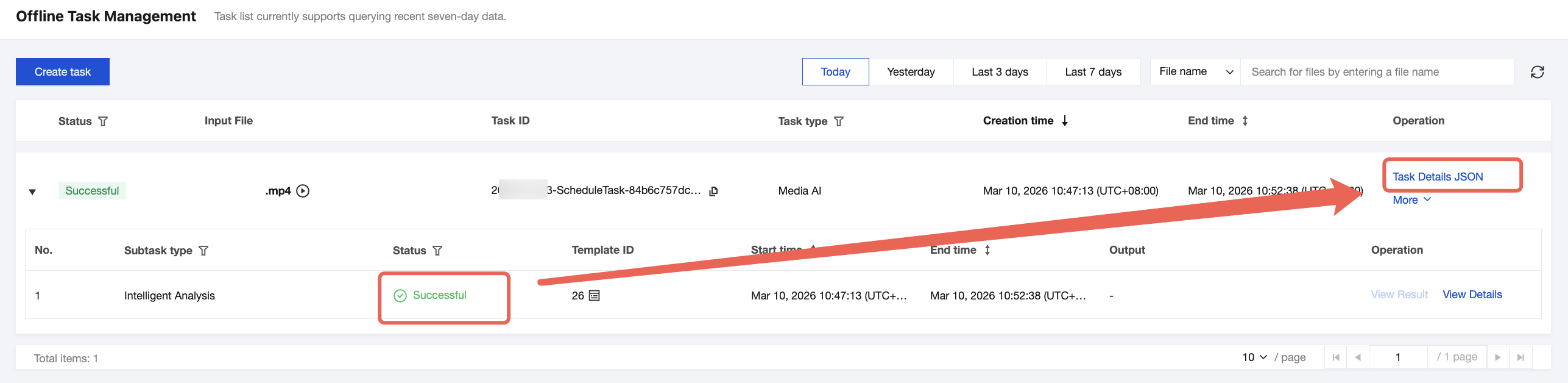 1. You can check the task status on the Task Management page in the console. When the subtask status is "Successful":