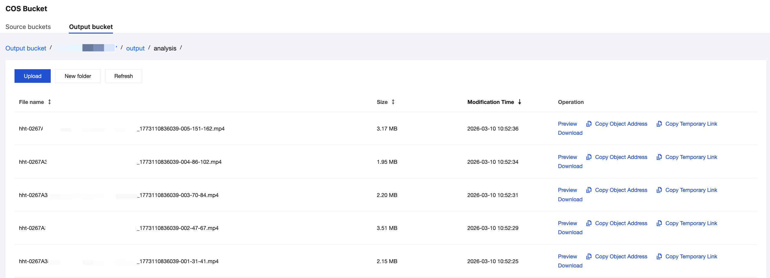 3. If you use COS as the output path, go to the COS Bucket > Output Bucket page in the MPS console to find your output directory. Files prefixed with hht in this directory are the Intelligent Highlights output files, including the video and cover image for each highlight clip.