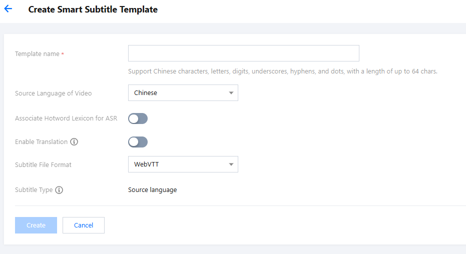 2. Enter the smart subtitle template creation page. The following configuration parameters are supported: