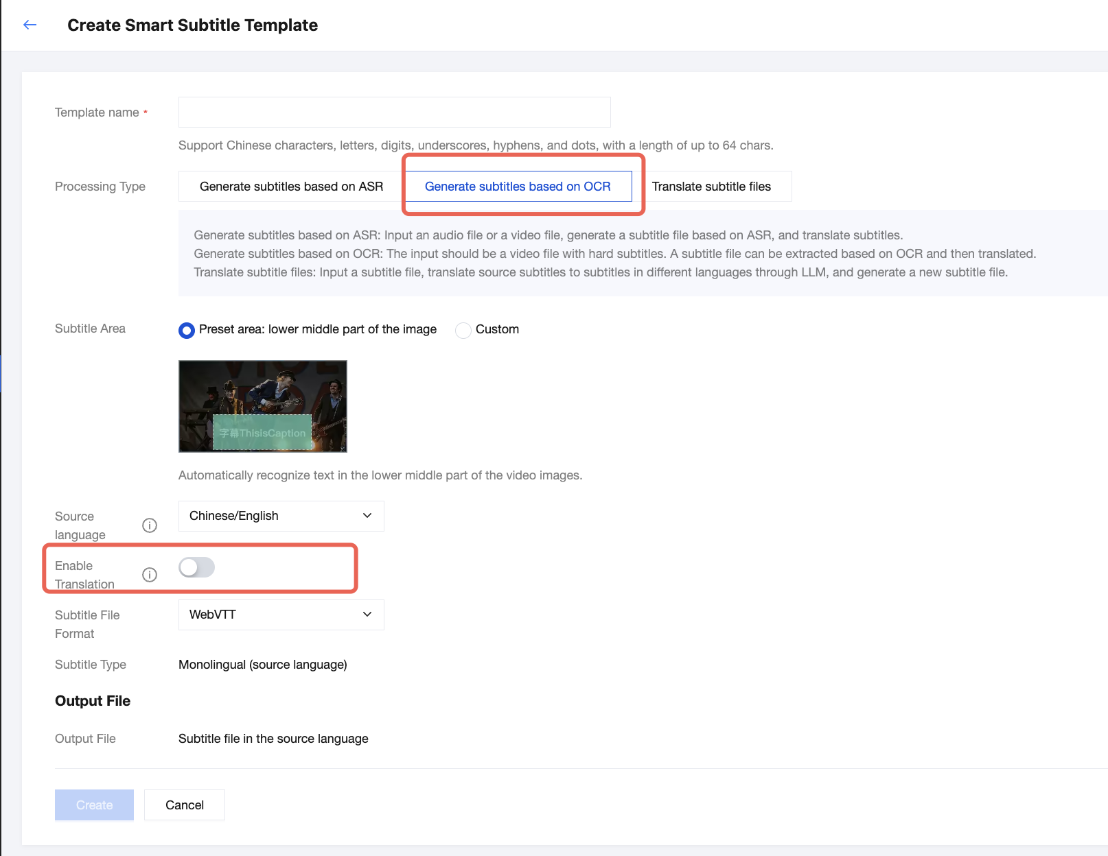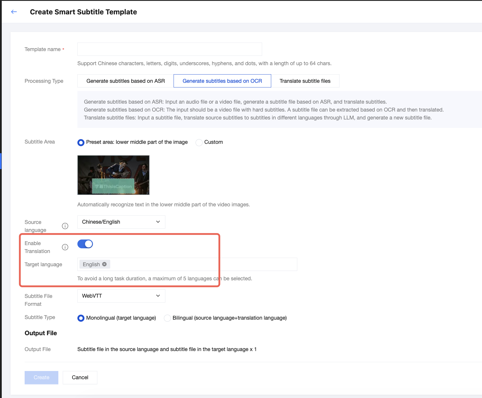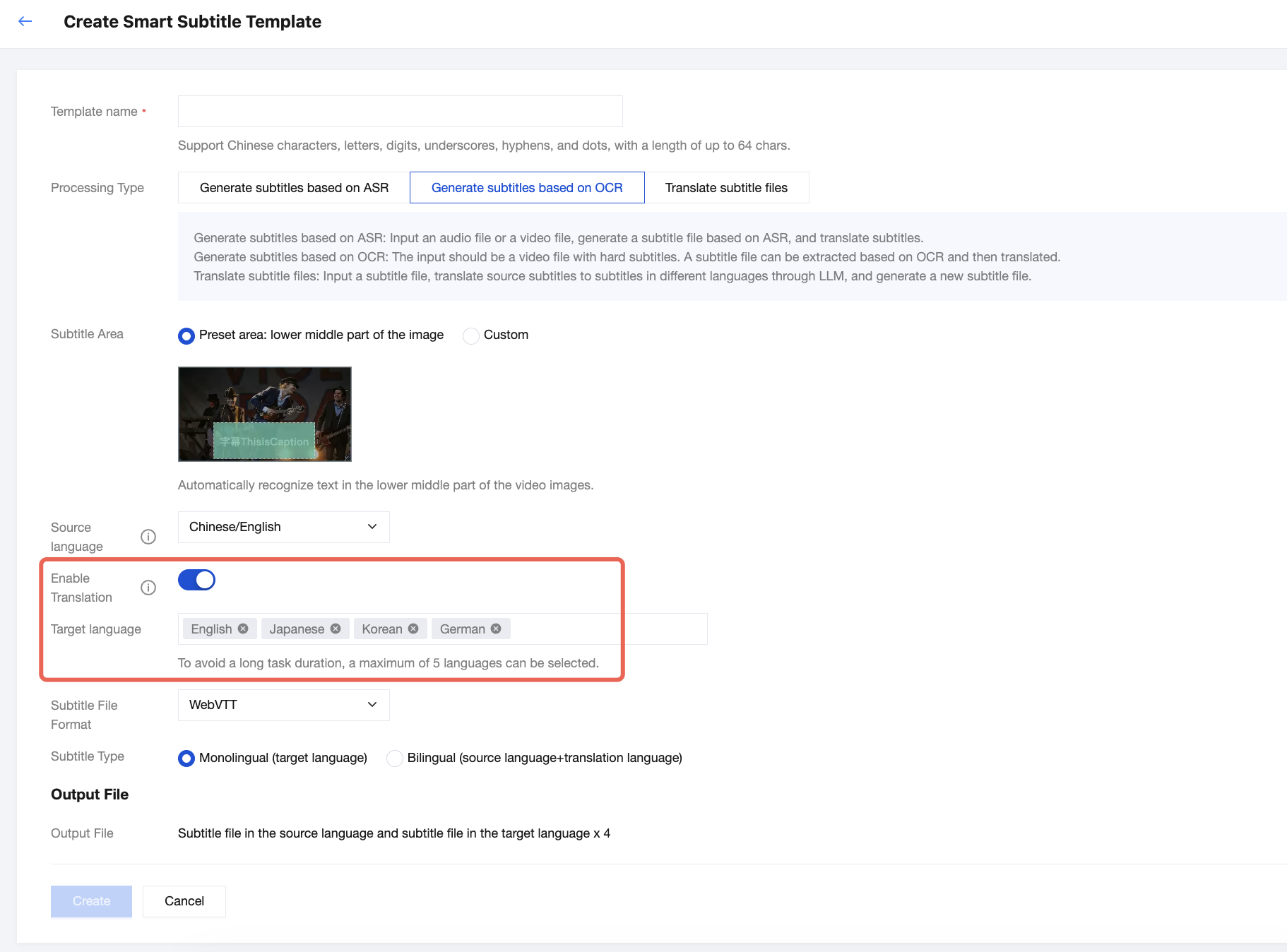 If "OCR-based subtitle generation" is selected as the processing type, translation is enabled, and one target language is selected, "OCR-based subtitle extraction and translation" fee will be charged. For pricing details, see relevant Billing Overview documentation.