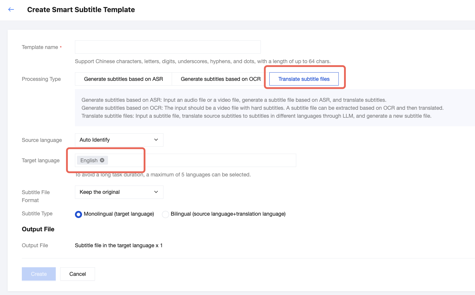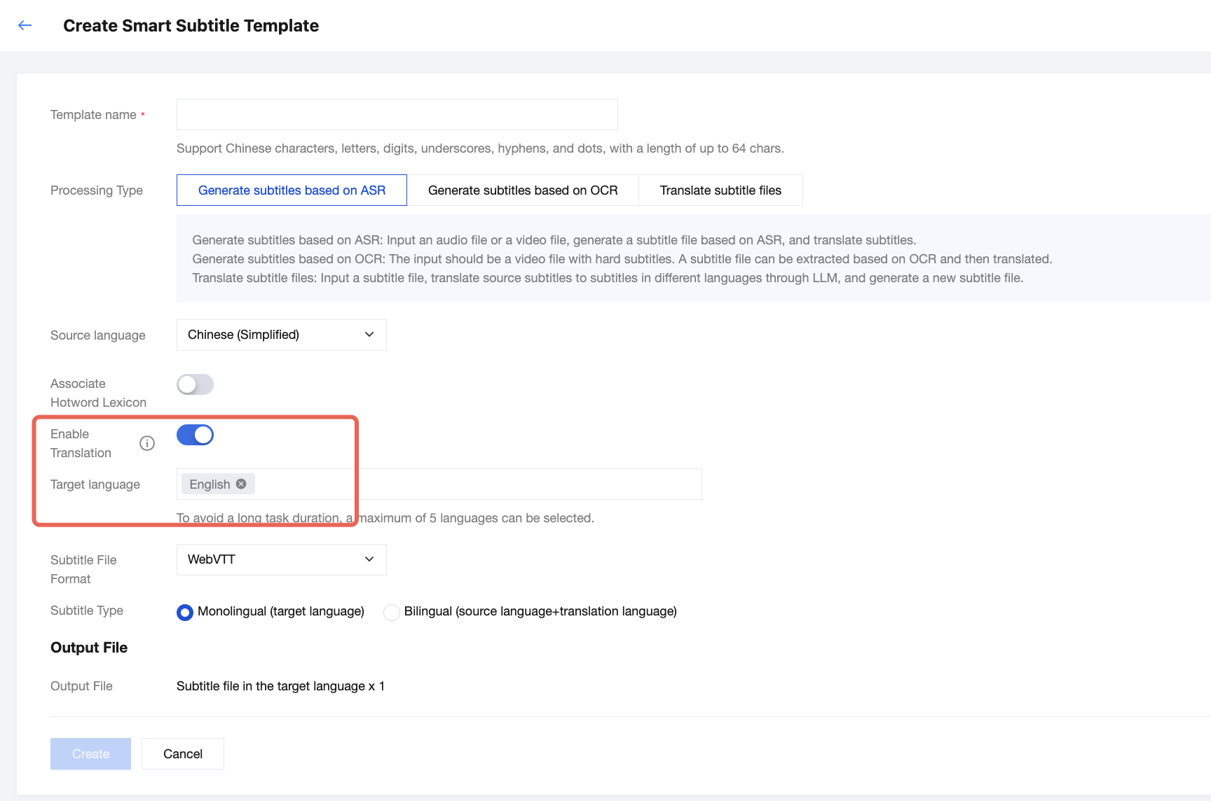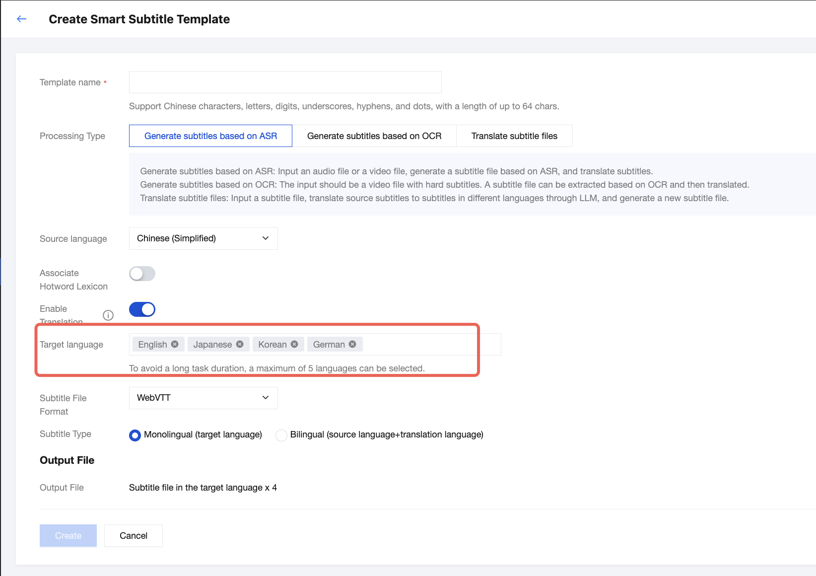 If "OCR-based subtitle generation" is selected as the processing type, translation is enabled, and one target language is selected, "OCR-based subtitle extraction and translation" fee will be charged. For pricing details, see relevant Billing Overview documentation.