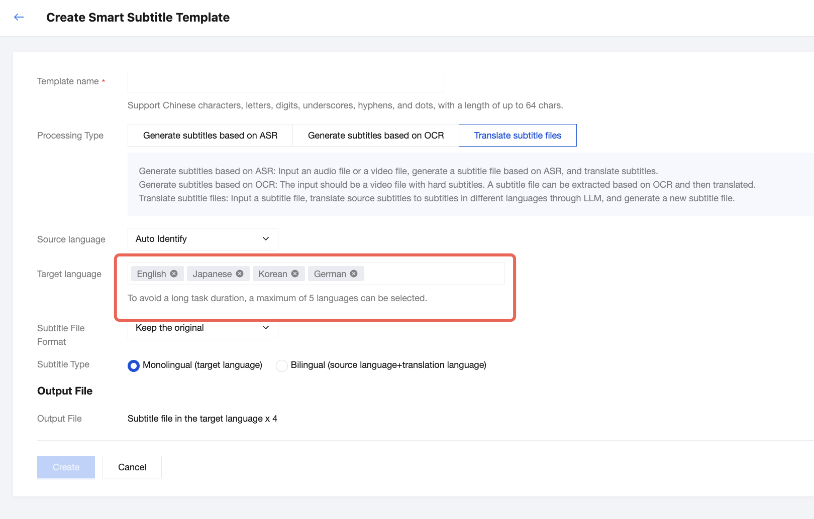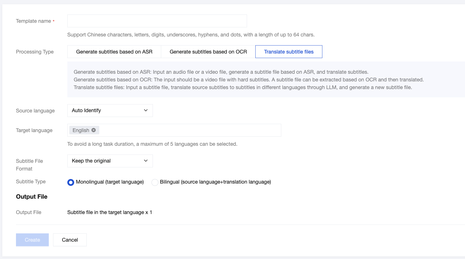 If "Subtitle file translation" is selected as the processing type and one target language is selected, "subtitle translation" fee will be charged. For pricing details, see relevant Billing Overview documentation.