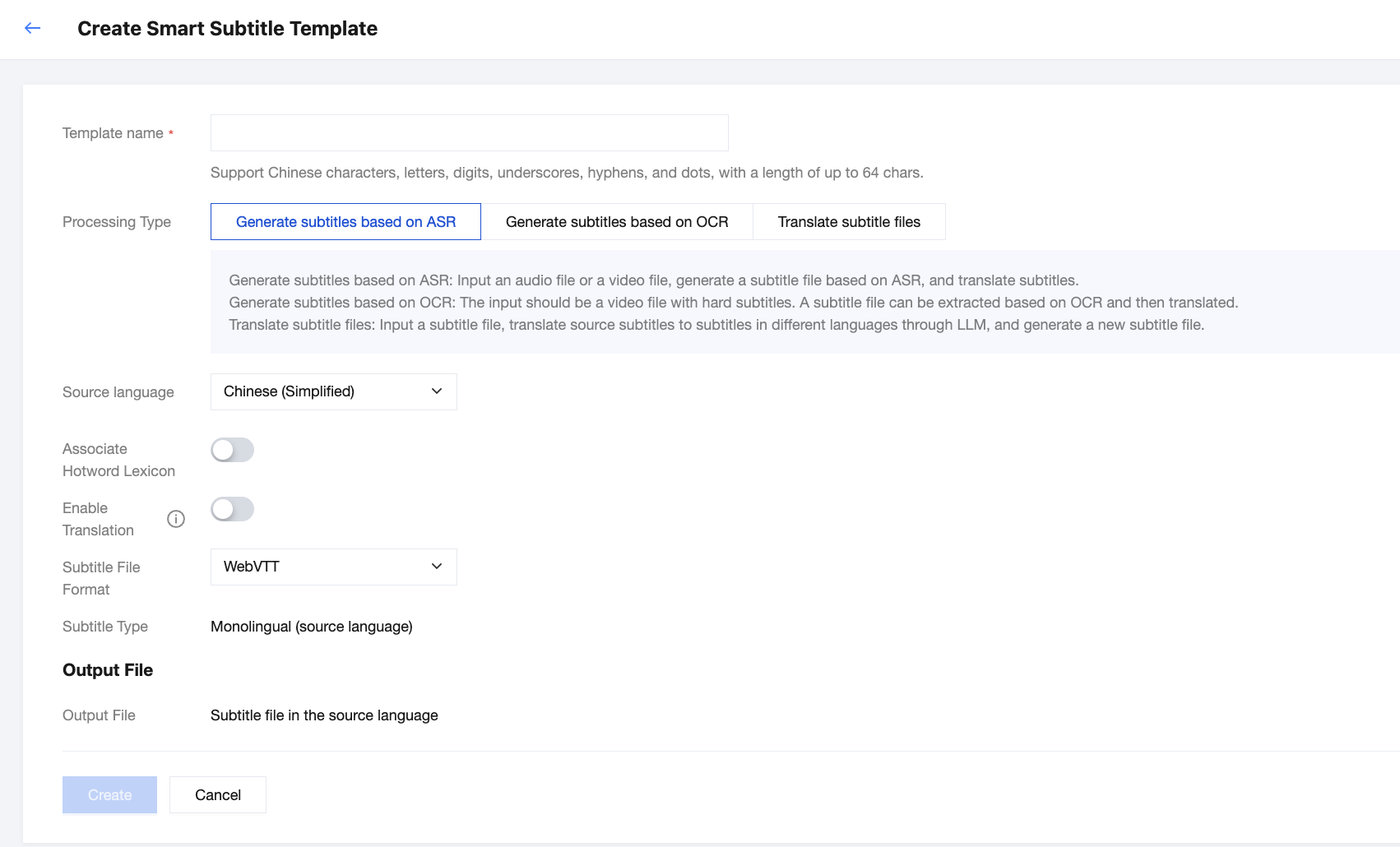 The smart subtitle feature can perform Automatic Speech Recognition (ASR) on the voice information in on-demand video files or live streams, convert it into subtitles, and translate it into multiple languages. It is suitable for scenarios such as live subtitles for streaming and video translation for overseas distribution. You can create custom smart subtitle templates and preset different process parameters for different use cases, to facilitate subsequent reuse.