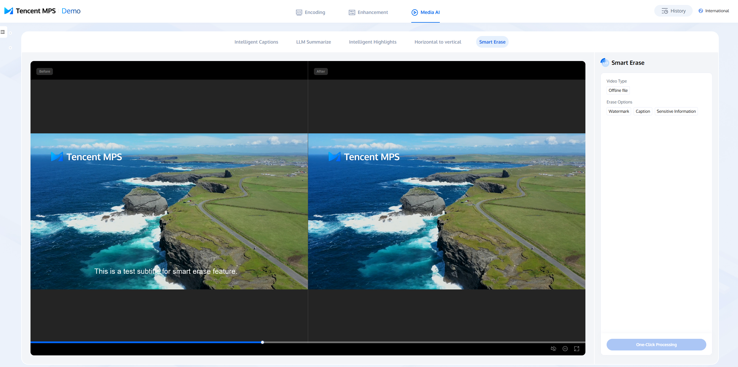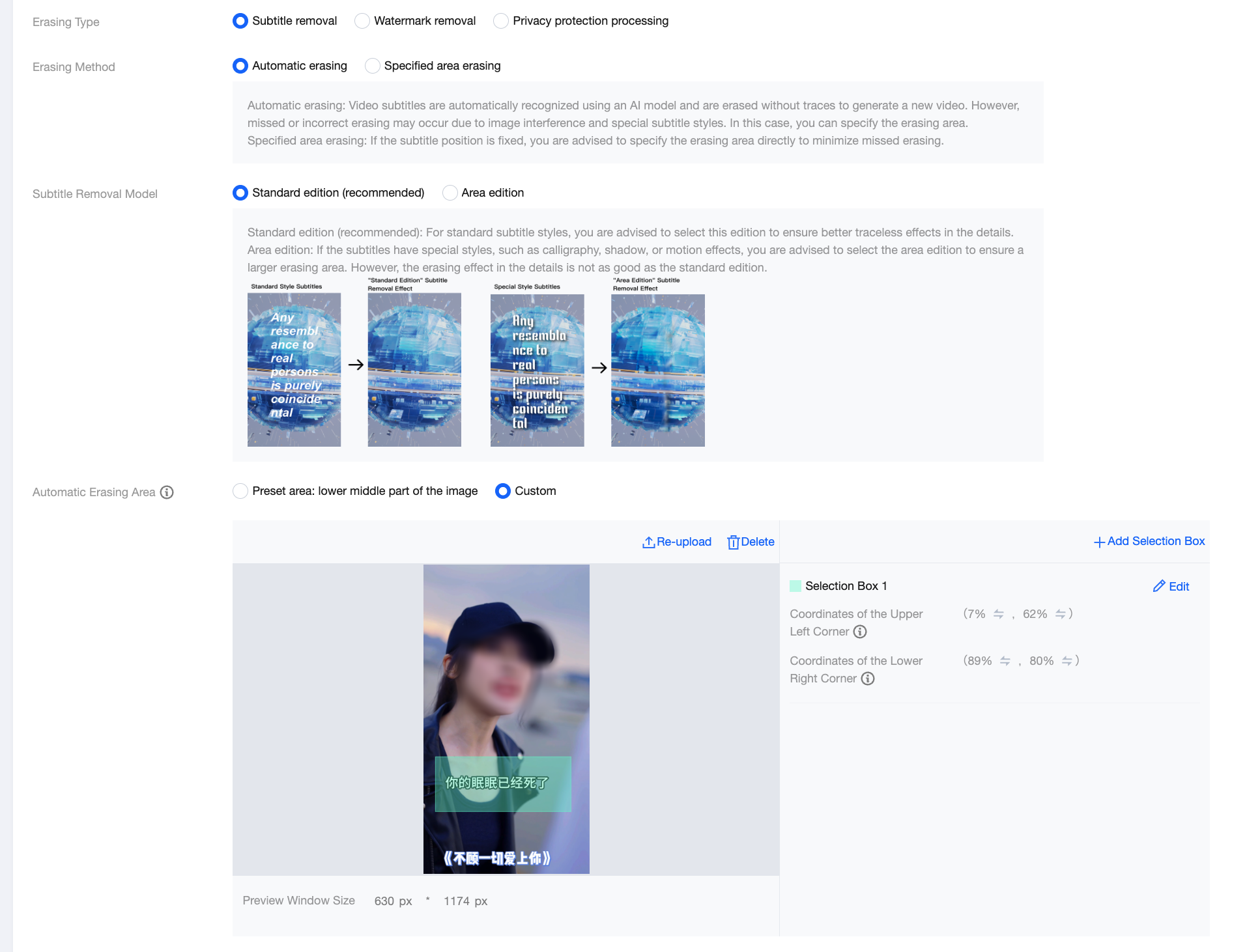 Smart Erase enables blurring, mosaic, or seamless processing of elements like logos, subtitles, human faces, and license plates in video images, thereby making it easy to spread and share content. The feature is widely used in multiple fields, such as short drama platforms, short video platforms, cross-border e-commerce, and independent media studios. For pricing, see Smart Erase Billing Instructions.