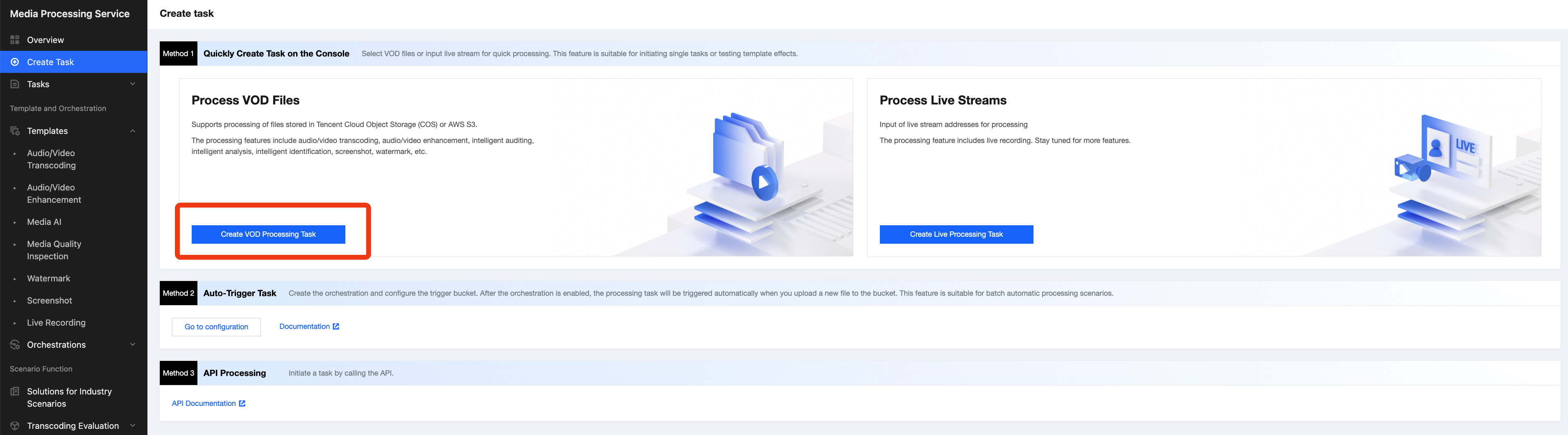 1. Go to the Create Task page of the console, and click Quickly Create VOD Processing Task.