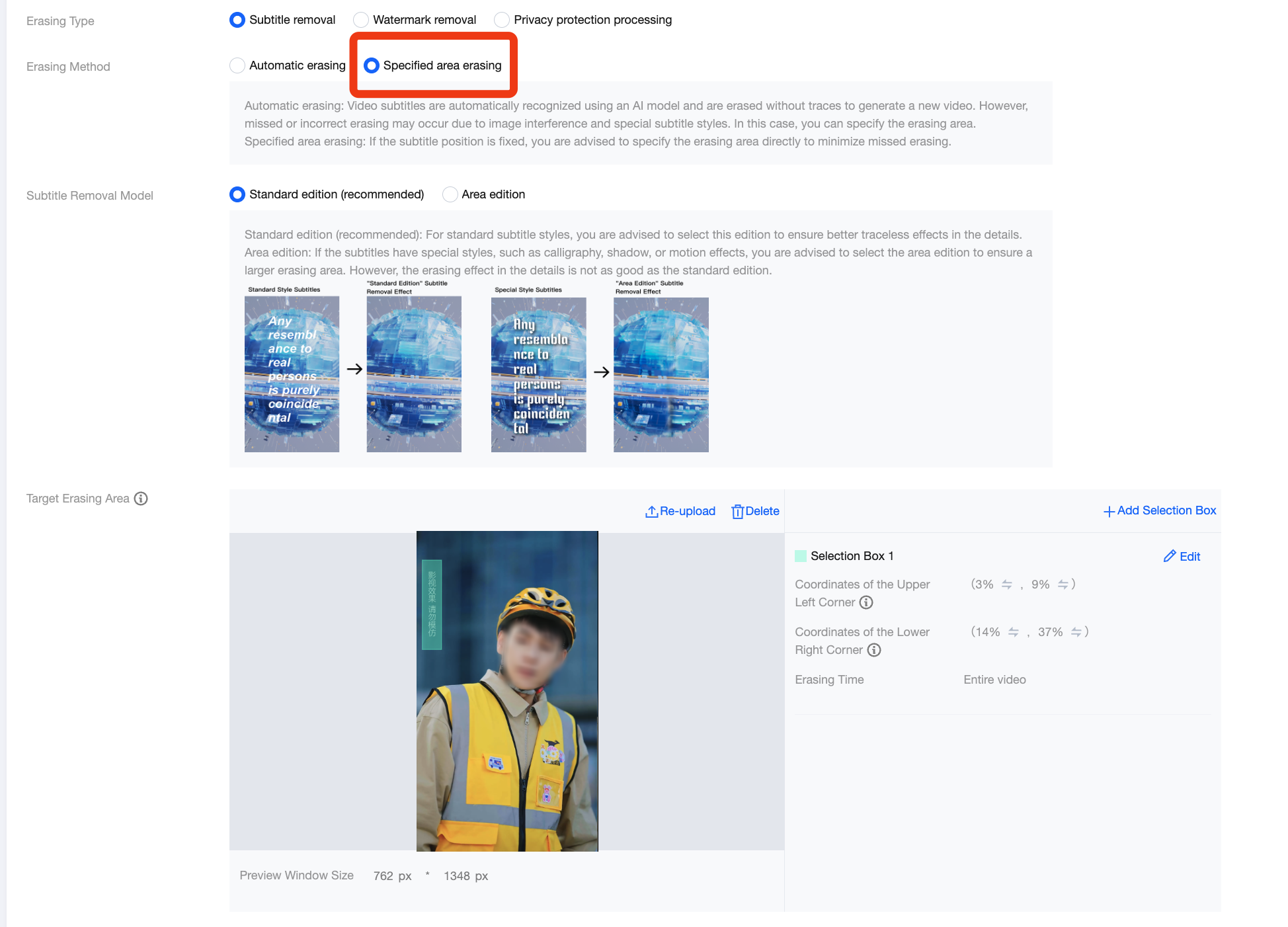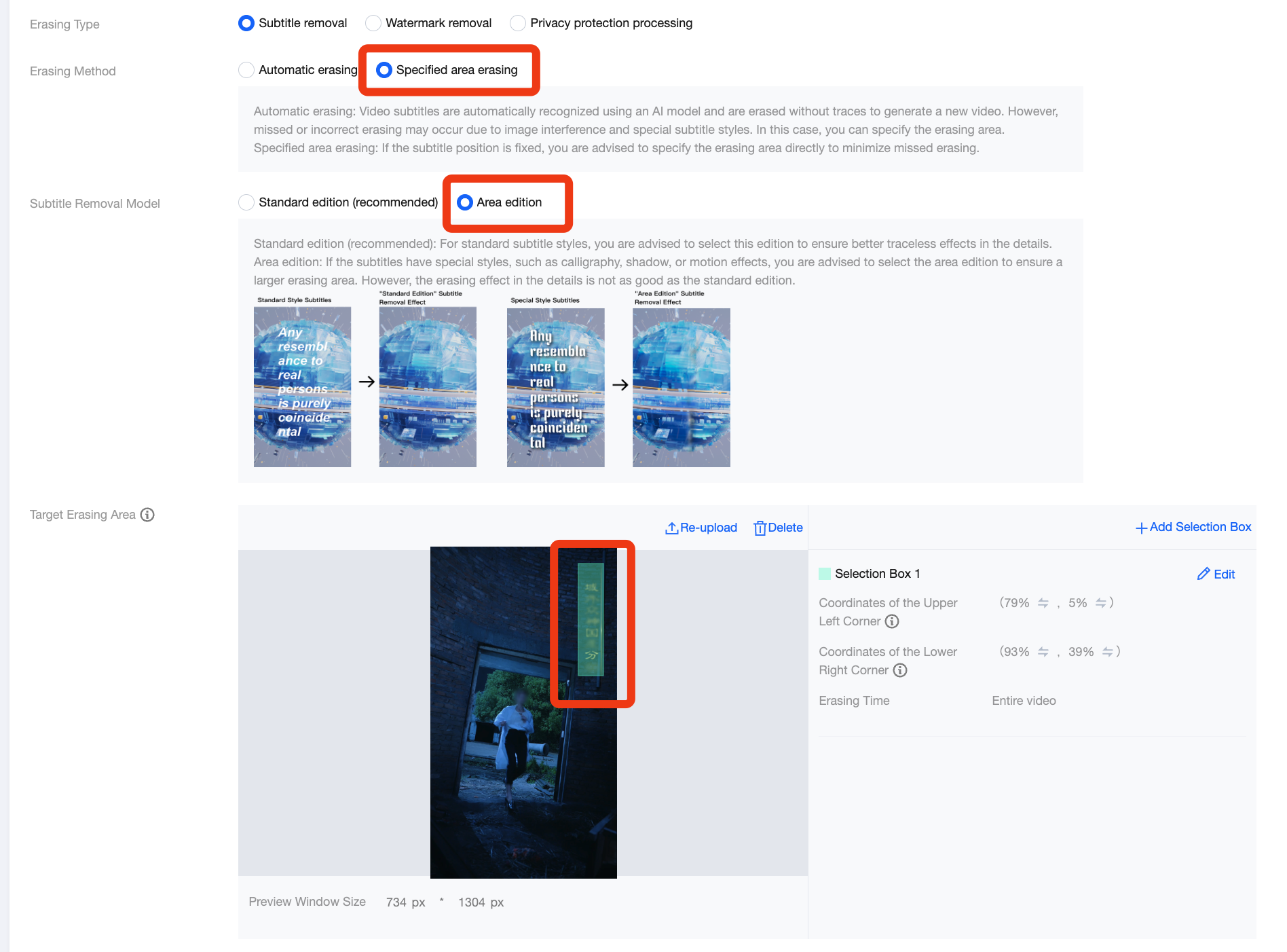 Area Edition: It is applicable for subtitles with special styles (such as background shadows, cursive fonts, and dynamic effects), with a larger erasing area but poorer removal effect compared with the Standard Edition.
