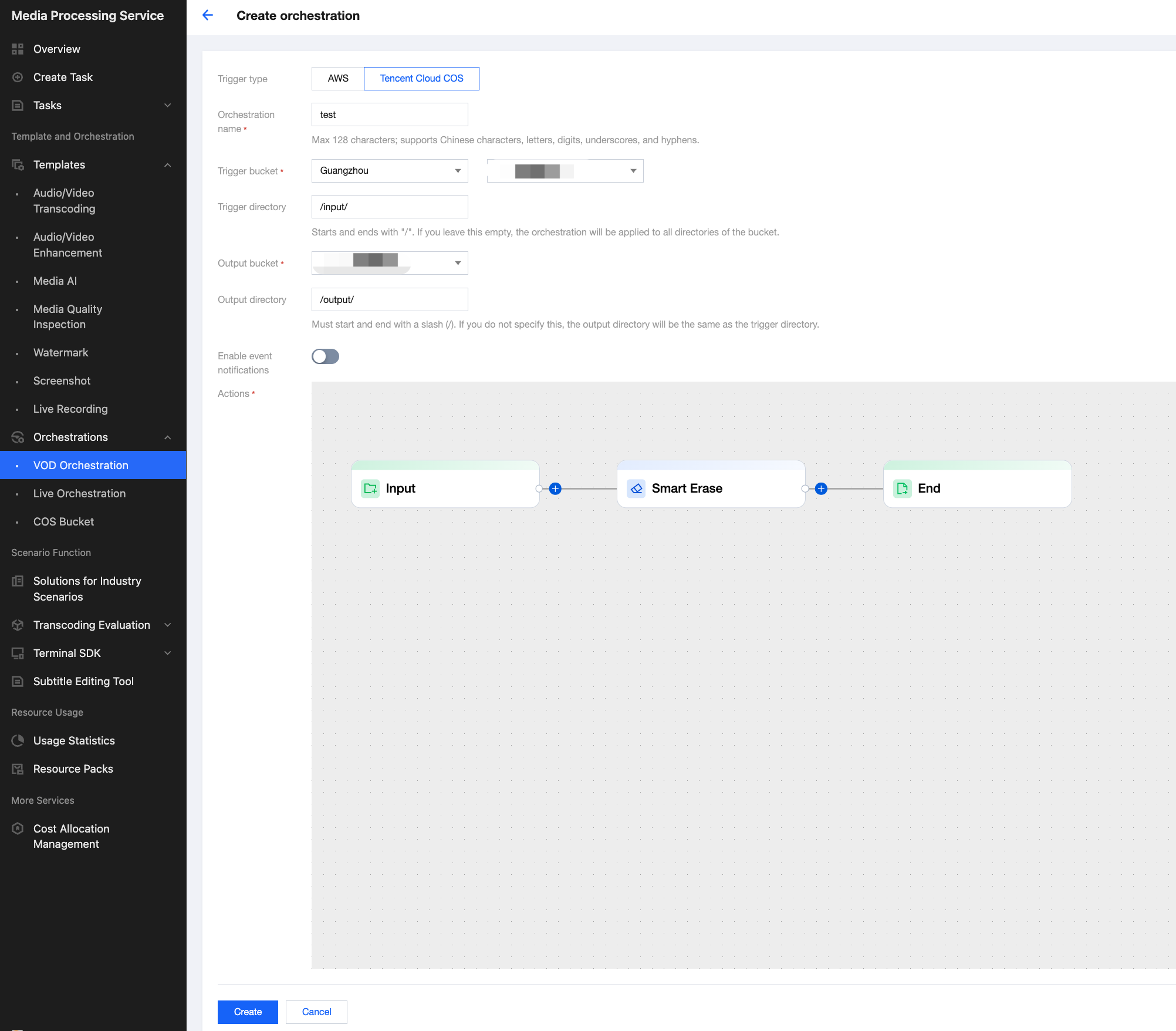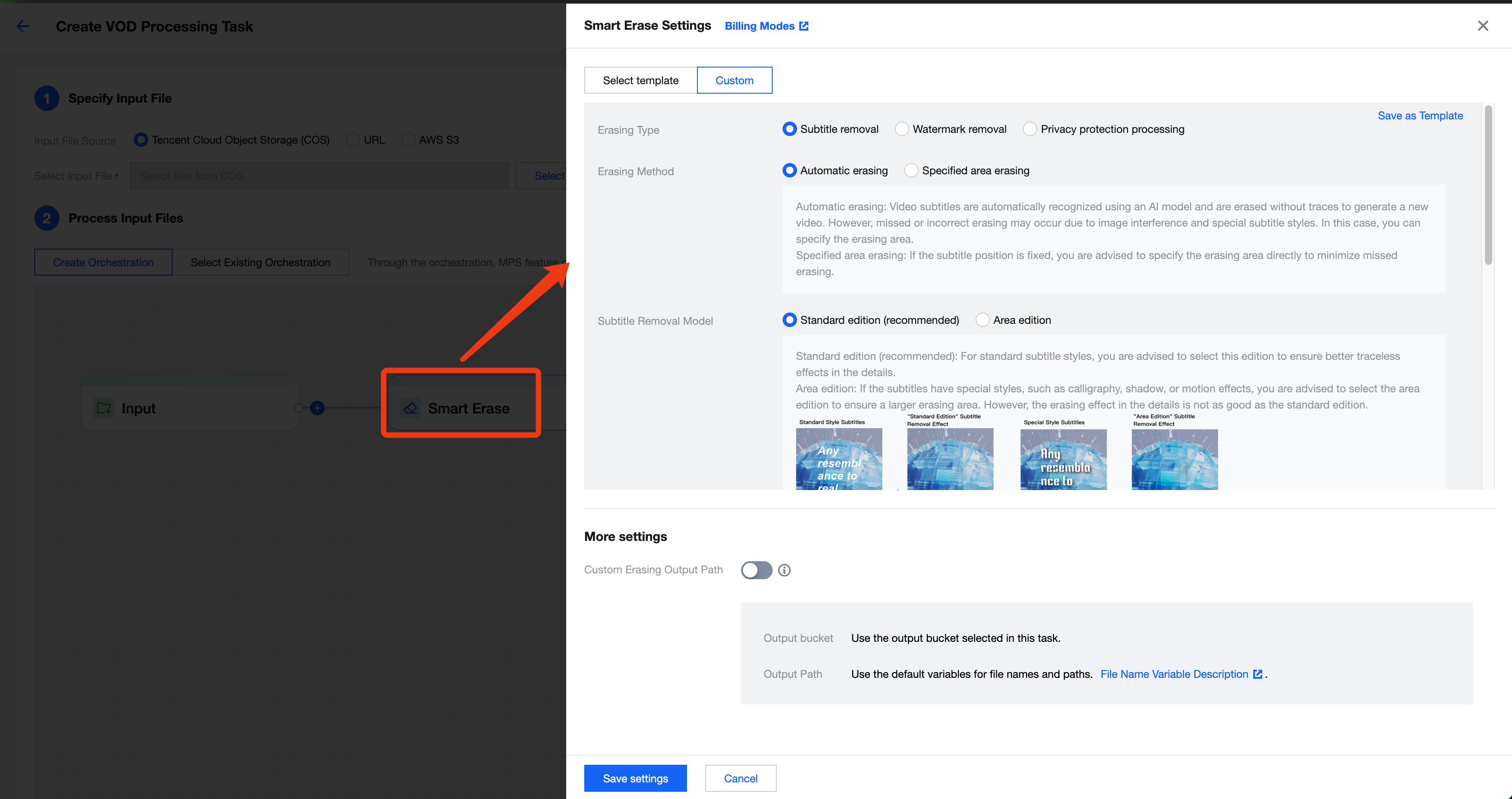Currently, the feature does not support custom configuration in the console. You can use Template 25 under the Intelligent Analysis feature of MPS and initiate it via extended parameters. For details, see Smart Erase Integration (Old).