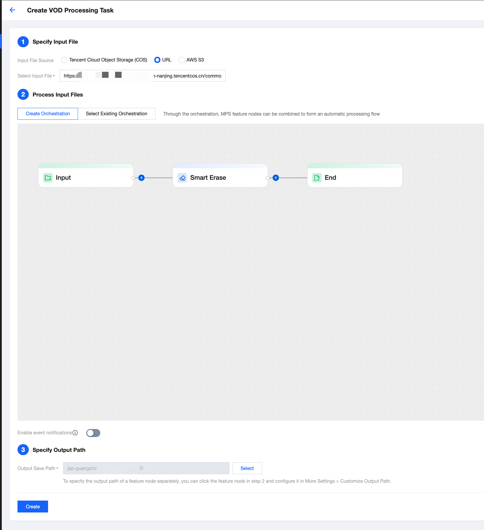 {"InputInfo":{ //Input video path. Replace it with your original video."Type":"URL","UrlInputInfo":{"Url":"https://test-1234567.cos.ap-nanjing.myqcloud.com/mps_test/myvideo.mp4"}},"OutputStorage":{ //Output COS bucket. Replace it."Type":"COS","CosOutputStorage":{"Bucket":"test","Region":"ap-nanjing"}},"OutputDir":"/mps_test/output/",//Output folder path. Replace it."SmartEraseTask":{"Definition": 00000 //Replace it with a smart erase template ID. 00000 is a sample code and has no practical significance.},TaskNotifyConfig":{ //Optional. Event callback notification configuration."NotifyType":"URL","NotifyUrl":"http://www.qq.com/callback"}}