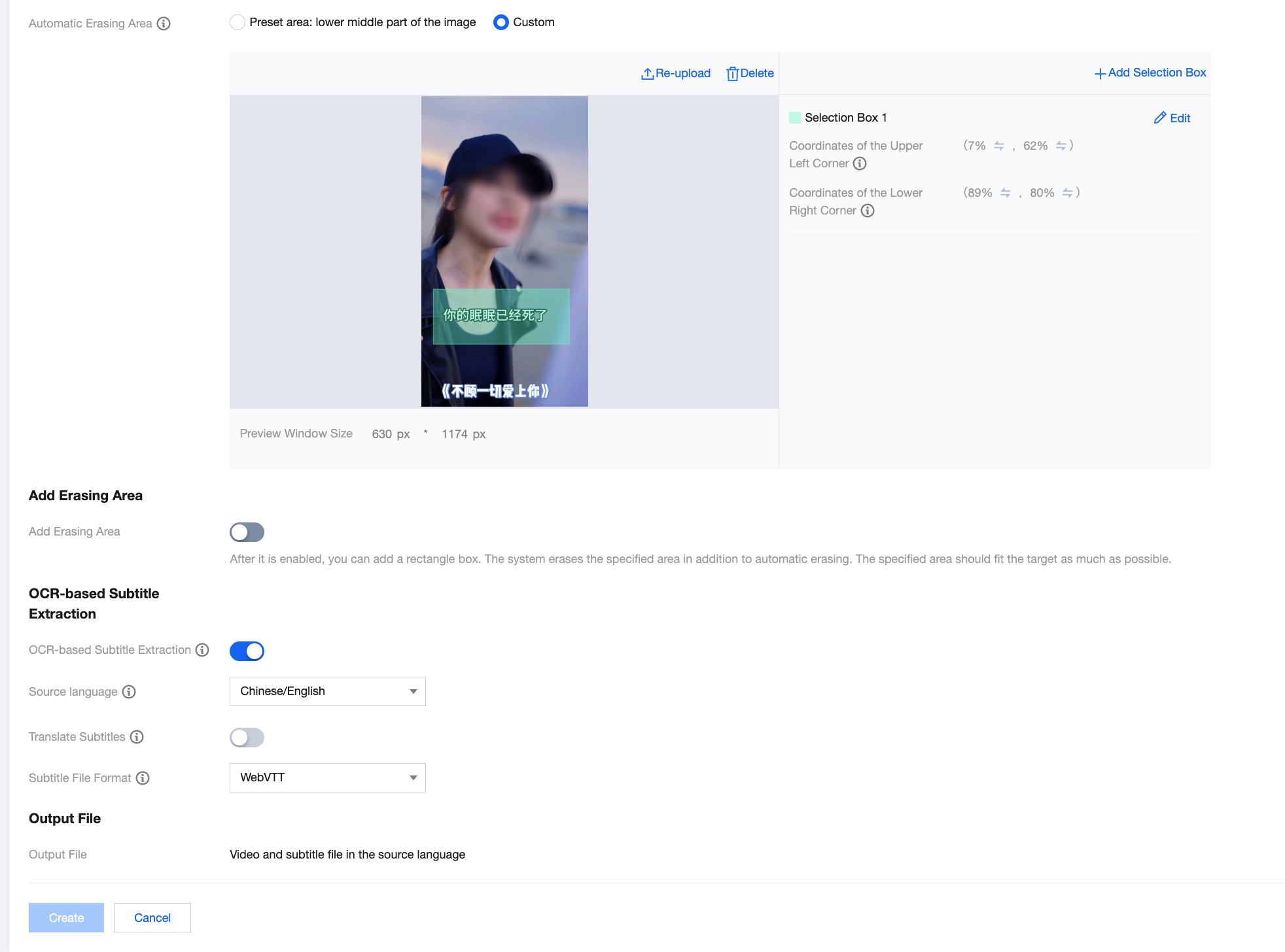 If only the original subtitles are extracted, the OCR-based subtitle extraction fee is charged. If subtitle translation is enabled, the OCR-based subtitle extraction and translation fees are charged. For pricing, see Smart Erase Billing Instructions.