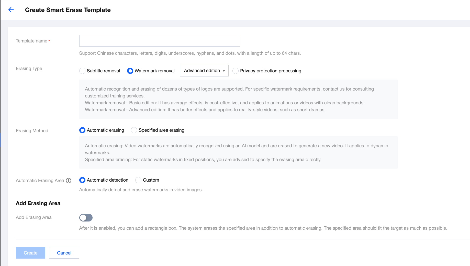 Starting from September 2025, the Smart Erase module is added to the console and API. This tutorial introduces the methods for accessing each feature based on the Smart Erase template. For customers who use the Intelligent Analysis template to access the erasing capability, see the Smart Erase Tutorial (Old) document.