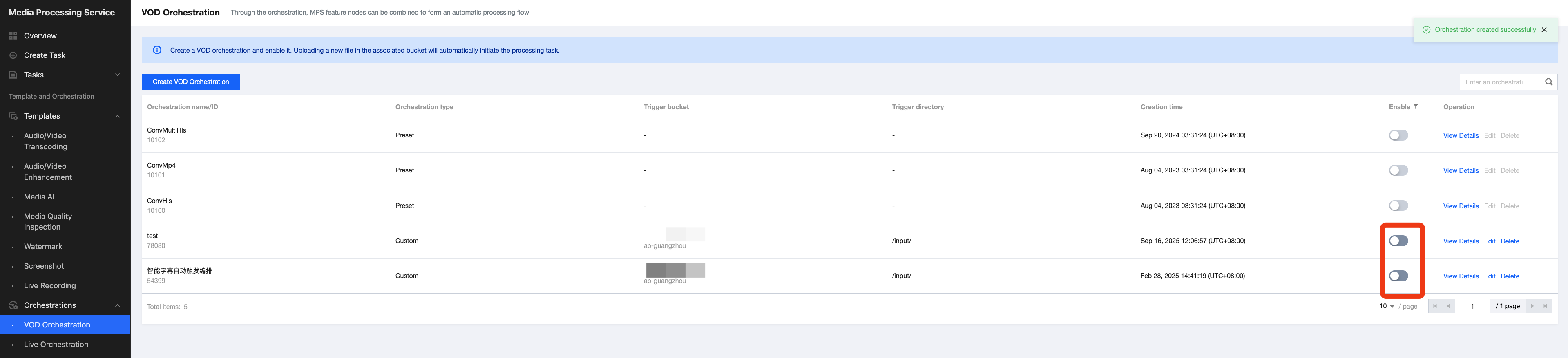 3. After the orchestration is created, go to the Video on Demand (VOD) orchestration list and enable the orchestration. Once the orchestration is enabled, whenever a video file is uploaded to the trigger directory, it will be automatically processed according to the task configuration in the orchestration. There is no need to manually create tasks in the console.