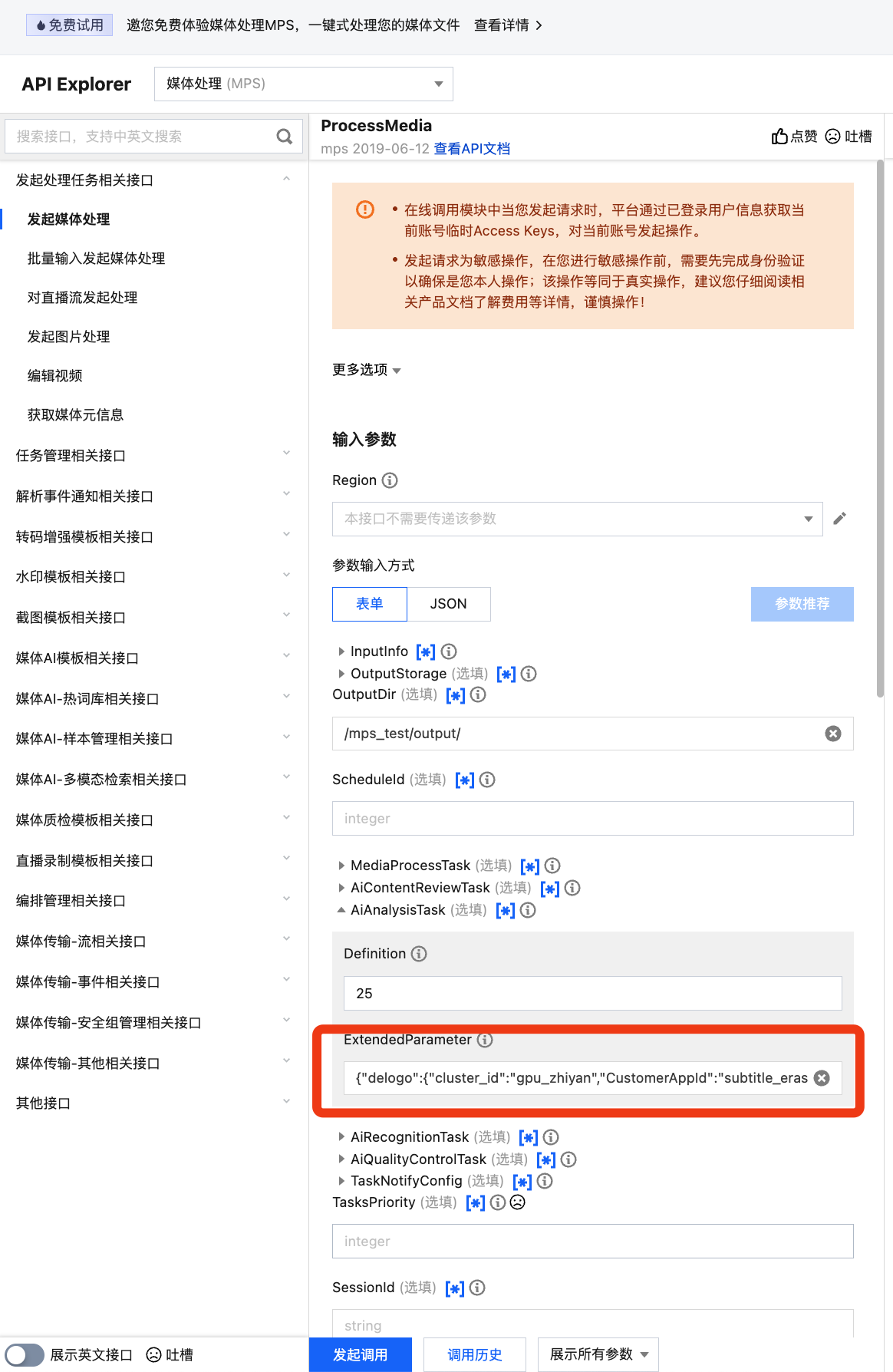 Call the ProcessMedia API, select the SmartEraseTask task, and set Definition to your desired smart erase template ID. The JSON example for ProcessMedia is as follows: