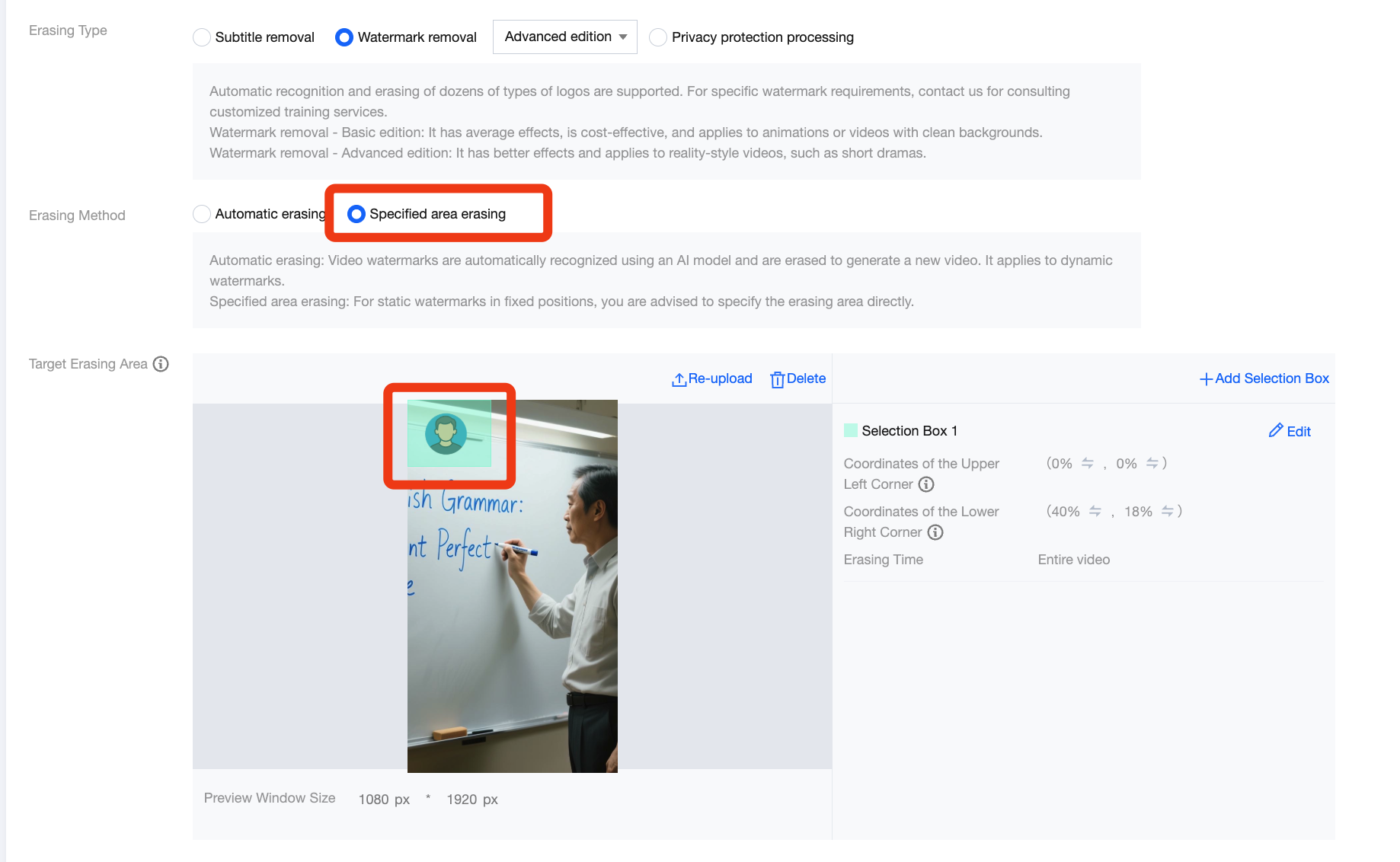 Specified area erasing: For static logos with a fixed position, it is recommended to use specified area erasing to reduce missed or incorrect erasing issues. In addition, image interference may negatively impact automatic erasing. This can be fixed through specified area erasing.
