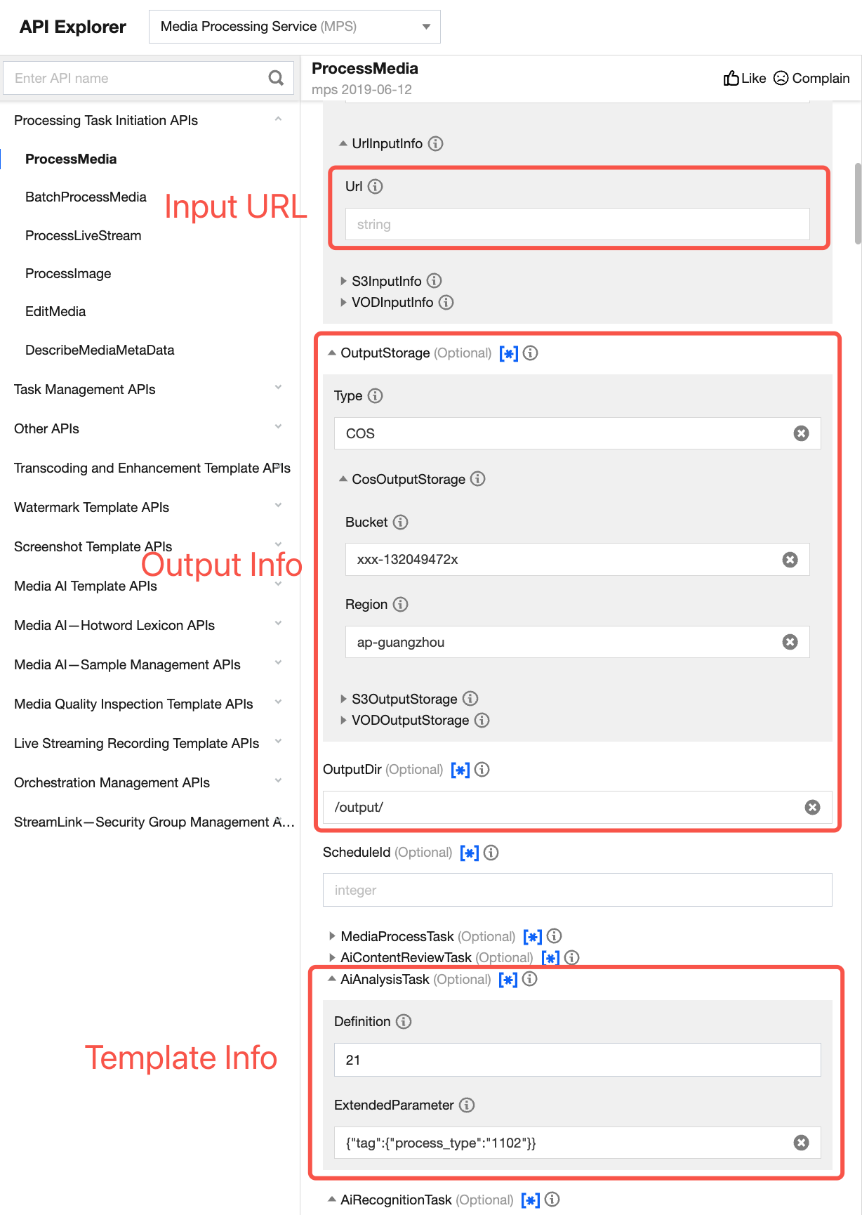 ProcessMedia API from the left-side API list. See the following figure to fill in the parameters such as input path, output path, and template ID. Set Definition to 21 (preset music identification template) under the AiAnalysisTask configuration to initiate the specified music identification task. ExtendedParameter is an extended parameter, and {"tag":{"process_type":"1102"}} is required to be filled in.