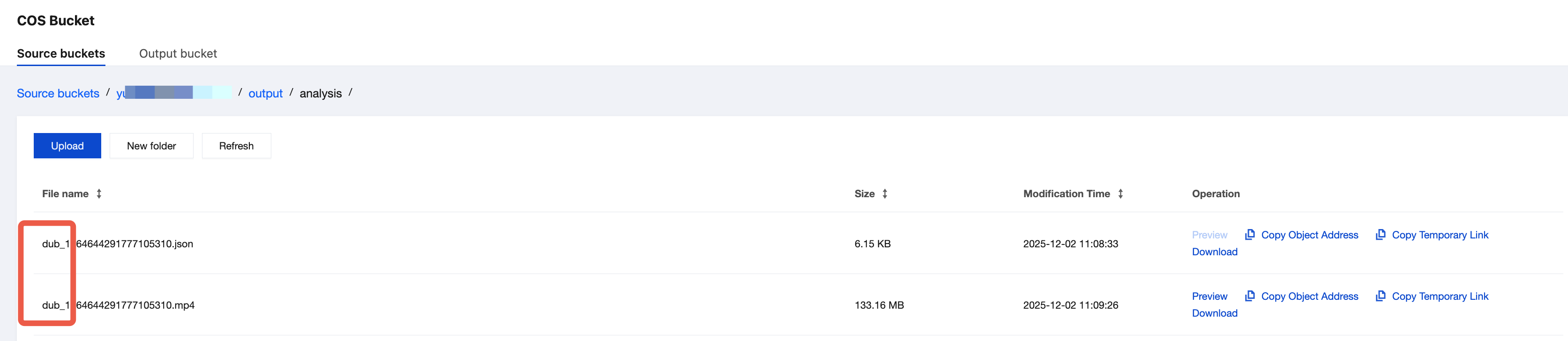 If COS is used as the output path, you can find the output file on the Orchestration Management > COS Bucket > Output Bucket page in the MPS console. The files with names similar to "dub-xxx.mp4" or "dub-xxx.json" are the processed video file and Speaker file generated after AI dubbing.