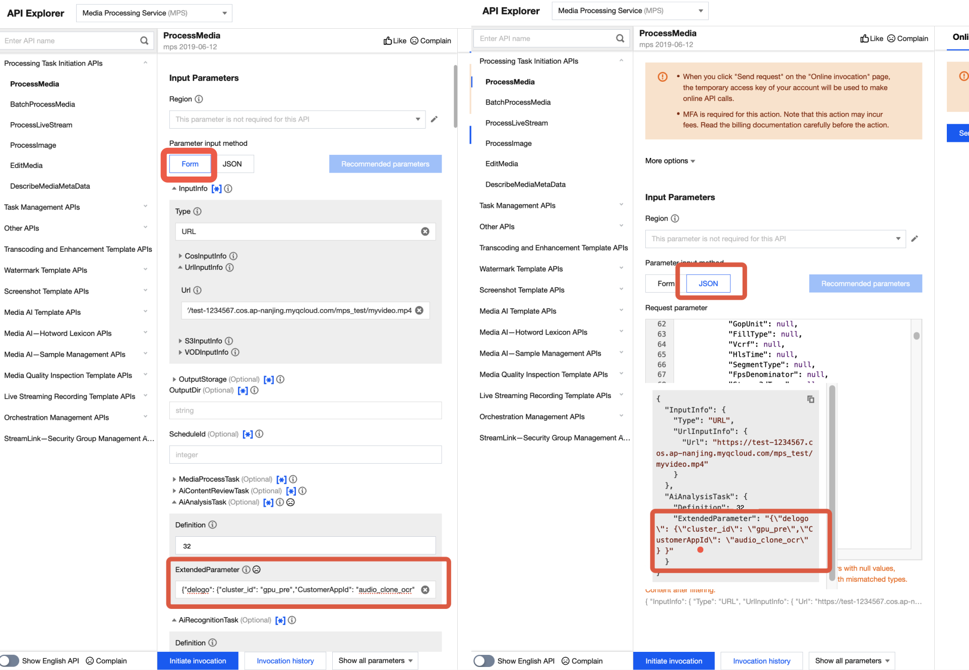 It is recommended that you use API Explorer for rapid verification. You can copy the above JSON data to the JSON mode in API Explorer, switch to the Form mode for automatic parsing, adjust required parameters such as input and output paths, and then click Initiate Call.