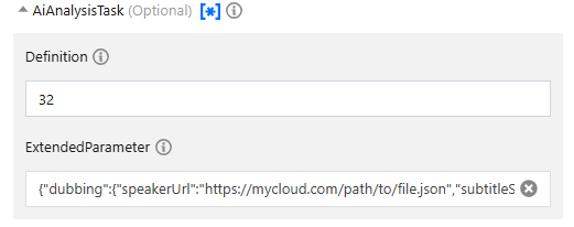 ExtendedParameter is used for customizing settings of AI dubbing tasks. All optional parameters and their descriptions are as follows:{"dubbing": {"speakerUrl": "https://mycloud.com/path/to/file.json", // Required. The Speaker file URL."subtitleStyle": { // Optional. The subtitle style."embed": true, // Specify whether to embed subtitles. This parameter is enabled by default."style": { // The subtitle style. This parameter is valid only when subtitle embedding is enabled."font": "simkai", // The font. Default value: "simkai"."fontSize": 50, // The font size. Default value: 50px."marginV": 50 // The bottom margin. Default value: 50.}},"outputPattern": "filename" // Optional. The prefix of the output file name.}}