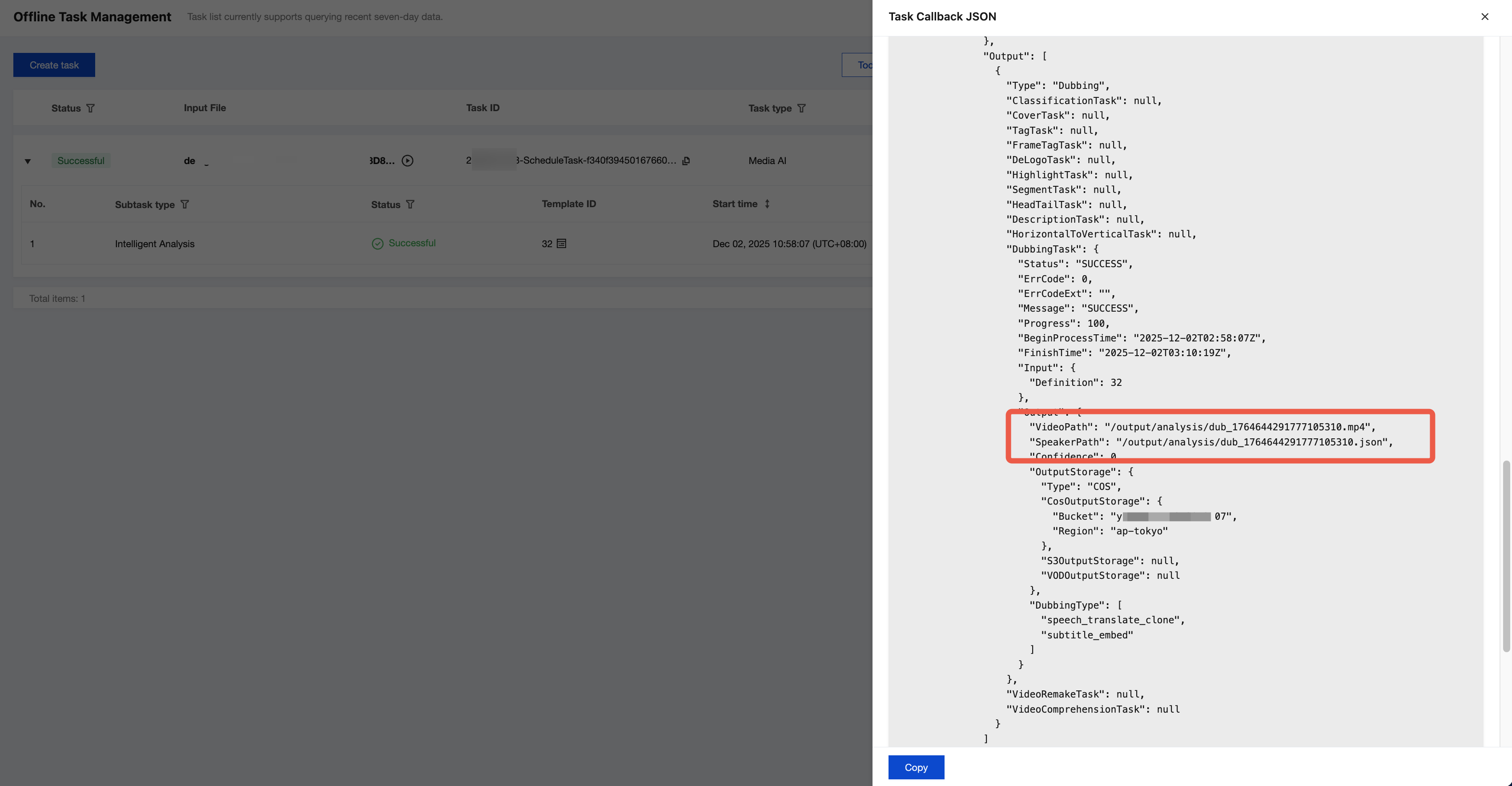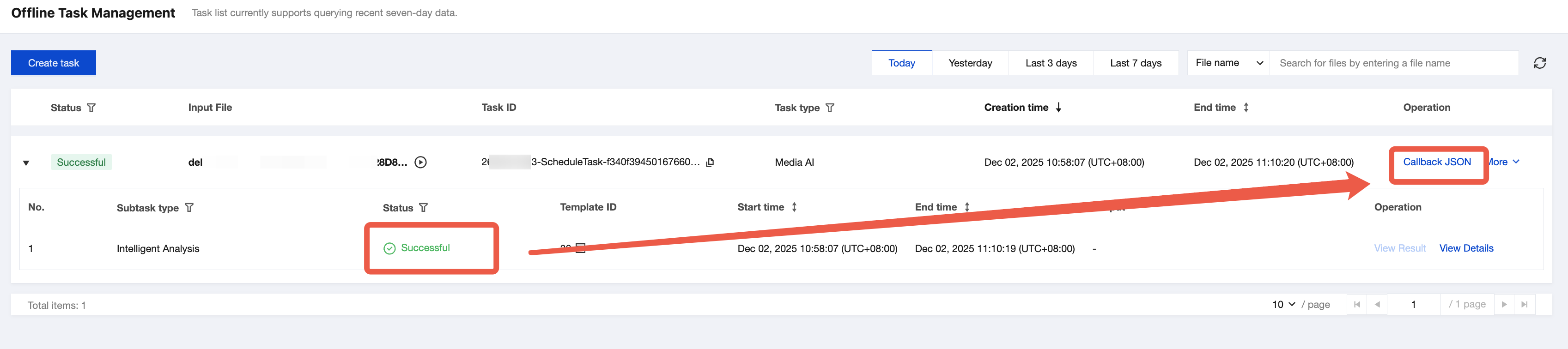 1. You can check the task status on the Task Management page in the console. When the subtask status is Successful, click Callback JSON.