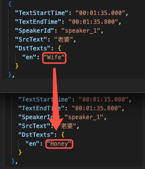 {"SrcLang": "zh","DstLangs": ["en"],"Speakers": [{"Id": "speaker_0","Gender": "male"},{"Id": "speaker_1","Gender": "female"}],"Clips": [{"TextStartTime": "00:00:00.100","TextEndTime": "00:00:00.600","SpeakerId": "speaker_0","SrcText": "没谁","DstTexts": {"en": "No one"}},{"TextStartTime": "00:00:01.0","TextEndTime": "00:00:01.200","SpeakerId": "speaker_1","SrcText": "早上好""DstTexts": {"en": "Morning"}}]}