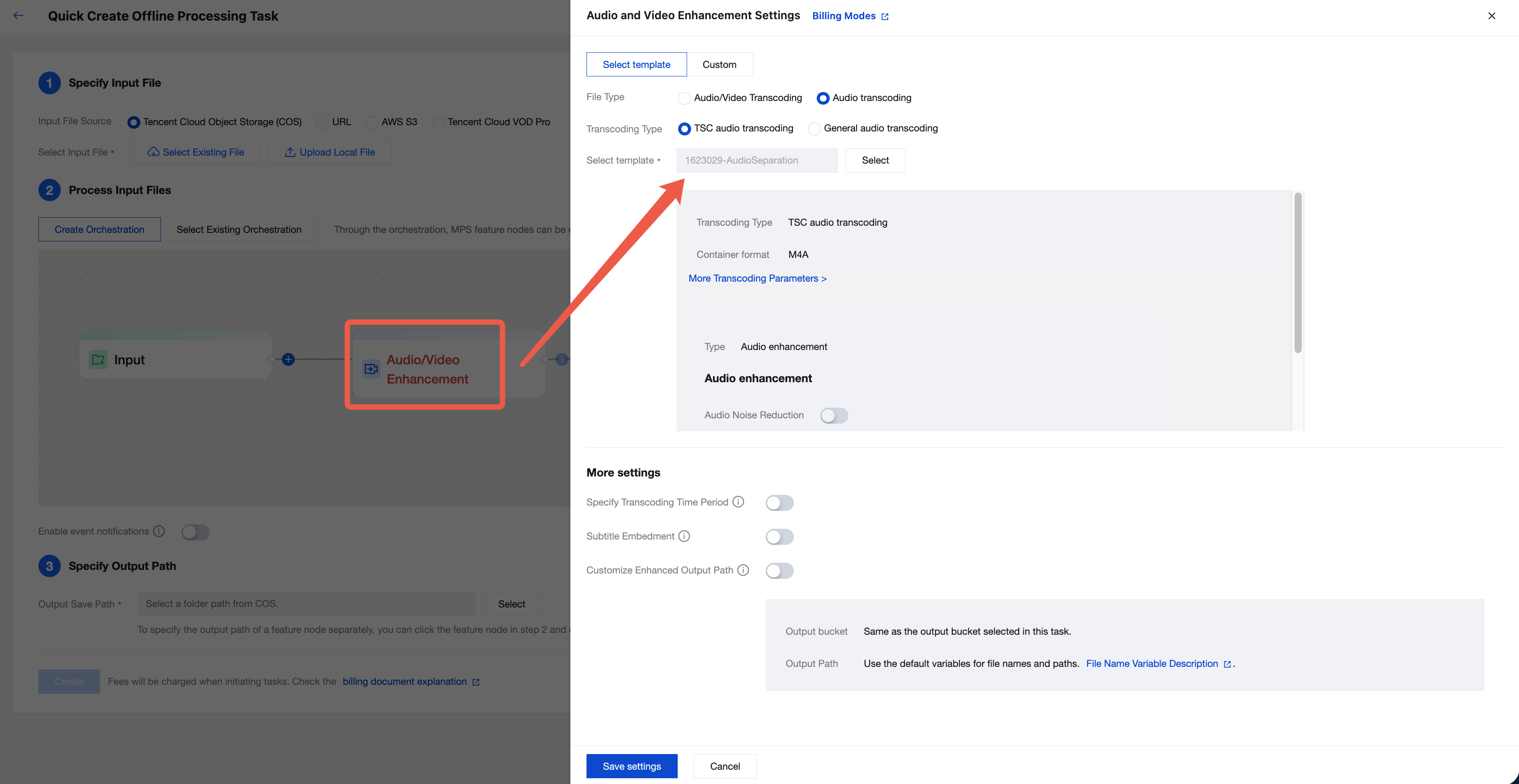 1. Enter the task creation page, select the "Audio/Video Enhancement" node, and choose the created template in the pop-up interface on the right.