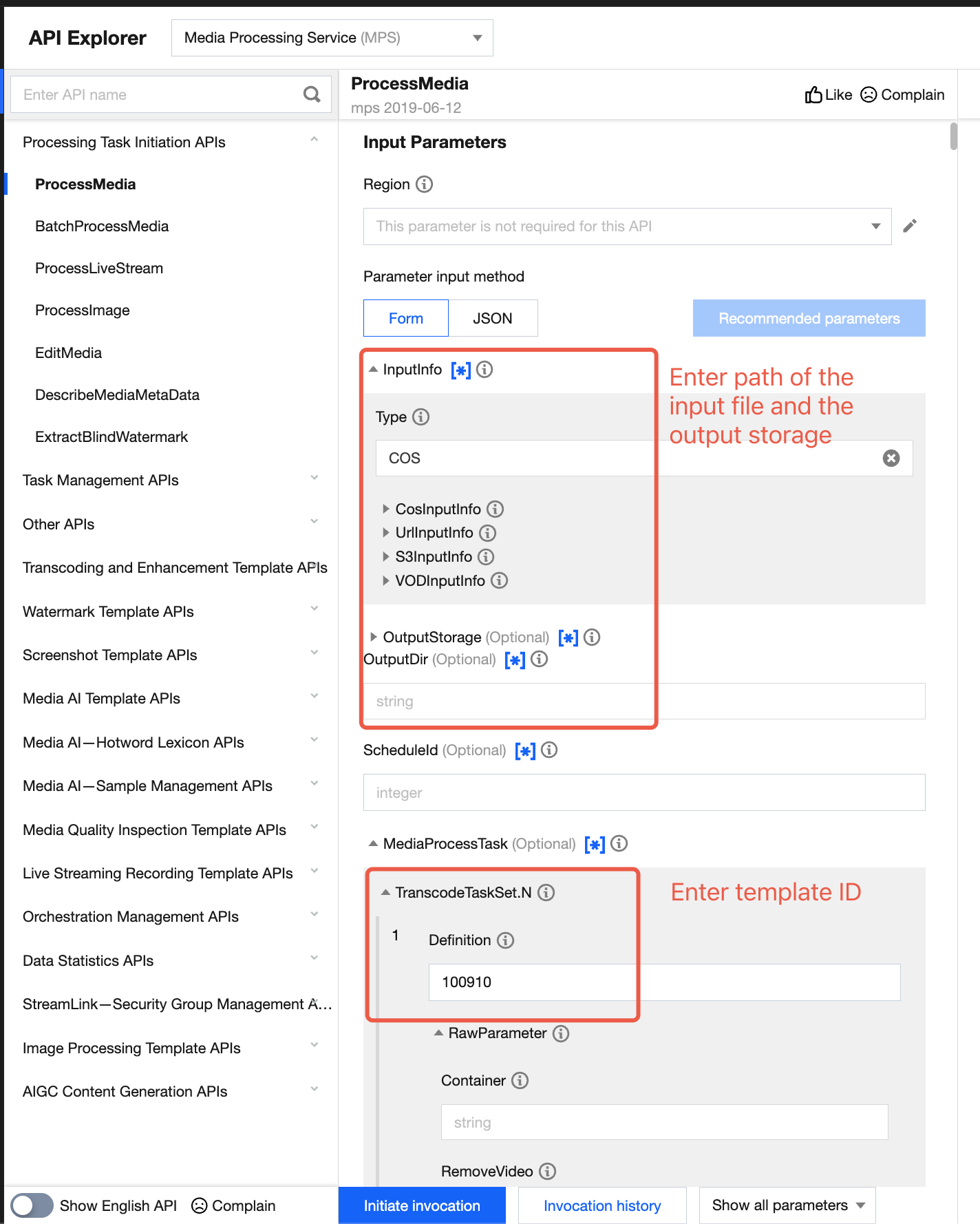 Call the ProcessMedia API, configure the input and output paths, and input the template ID in