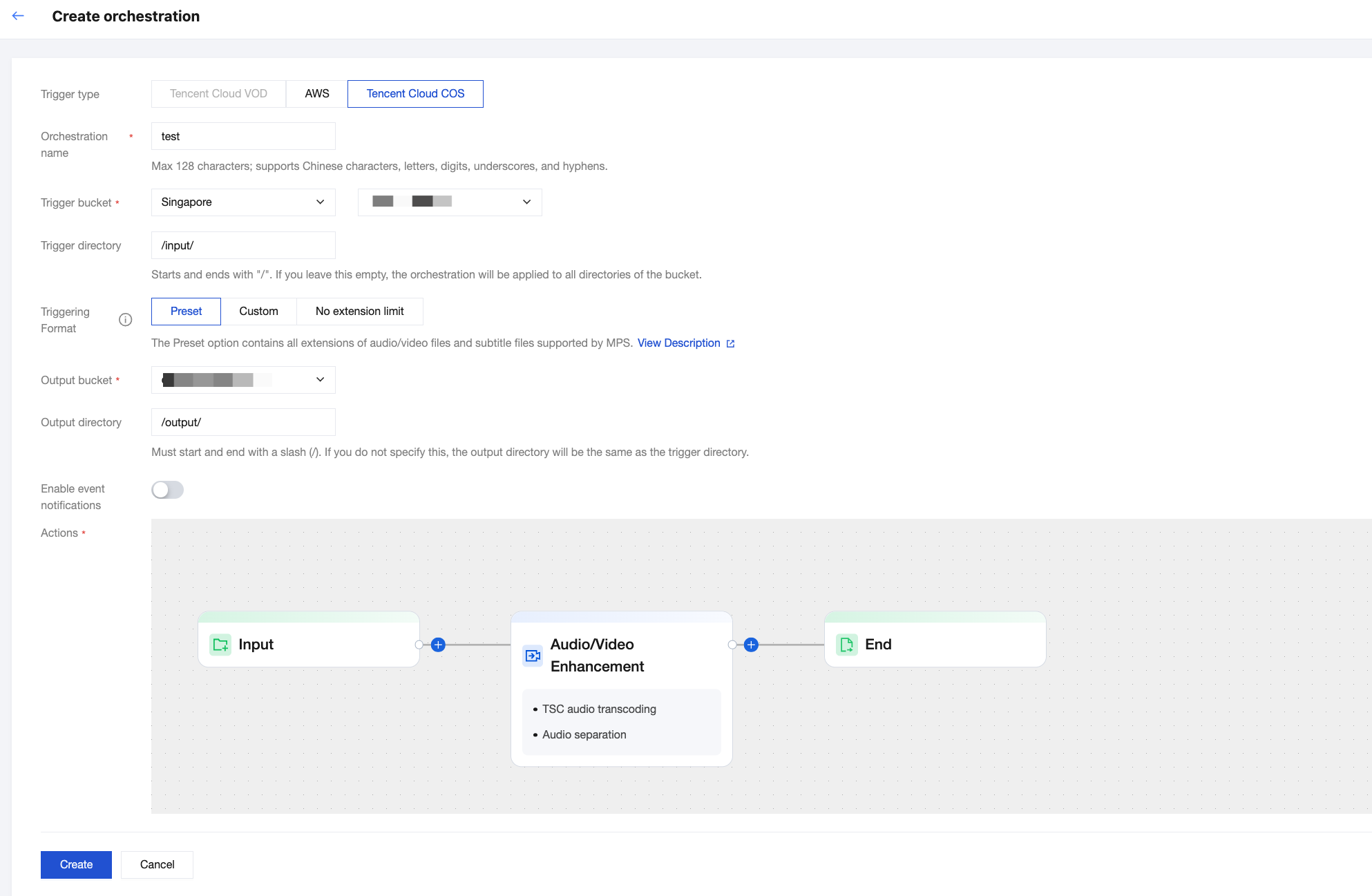 1. Create an orchestration and configure the trigger Bucket, trigger directory, and other parameters. Select the audio/video enhancement node in the task configuration and associate it with the audio separation template.