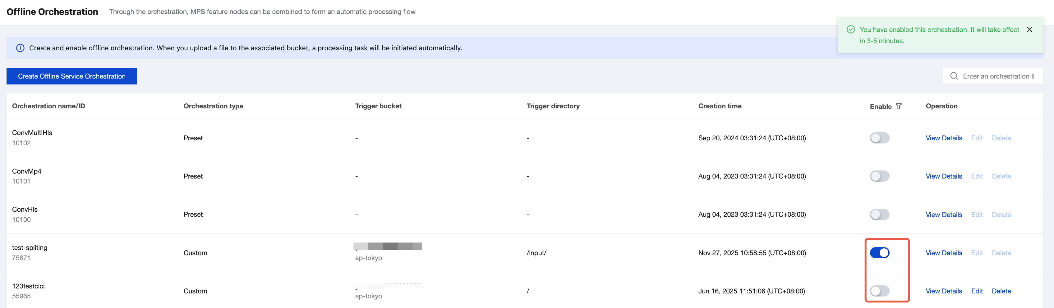 2. Then enter the offline orchestration list, find the newly created arrangement, and click the enable button to start it up. Subsequently, newly-added video files in the trigger directory will automatically initiate tasks according to the arrangement's preset process and parameters, and save the processed video files to the output path configured by the arrangement.