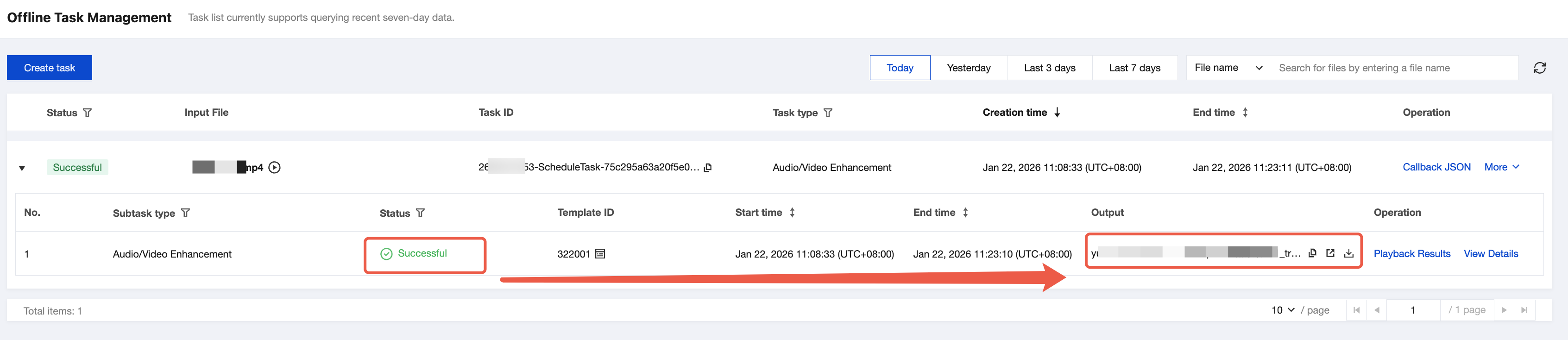 When the subtask status is "successful", you can preview, download, or navigate to the corresponding COS Bucket directory for the output file.