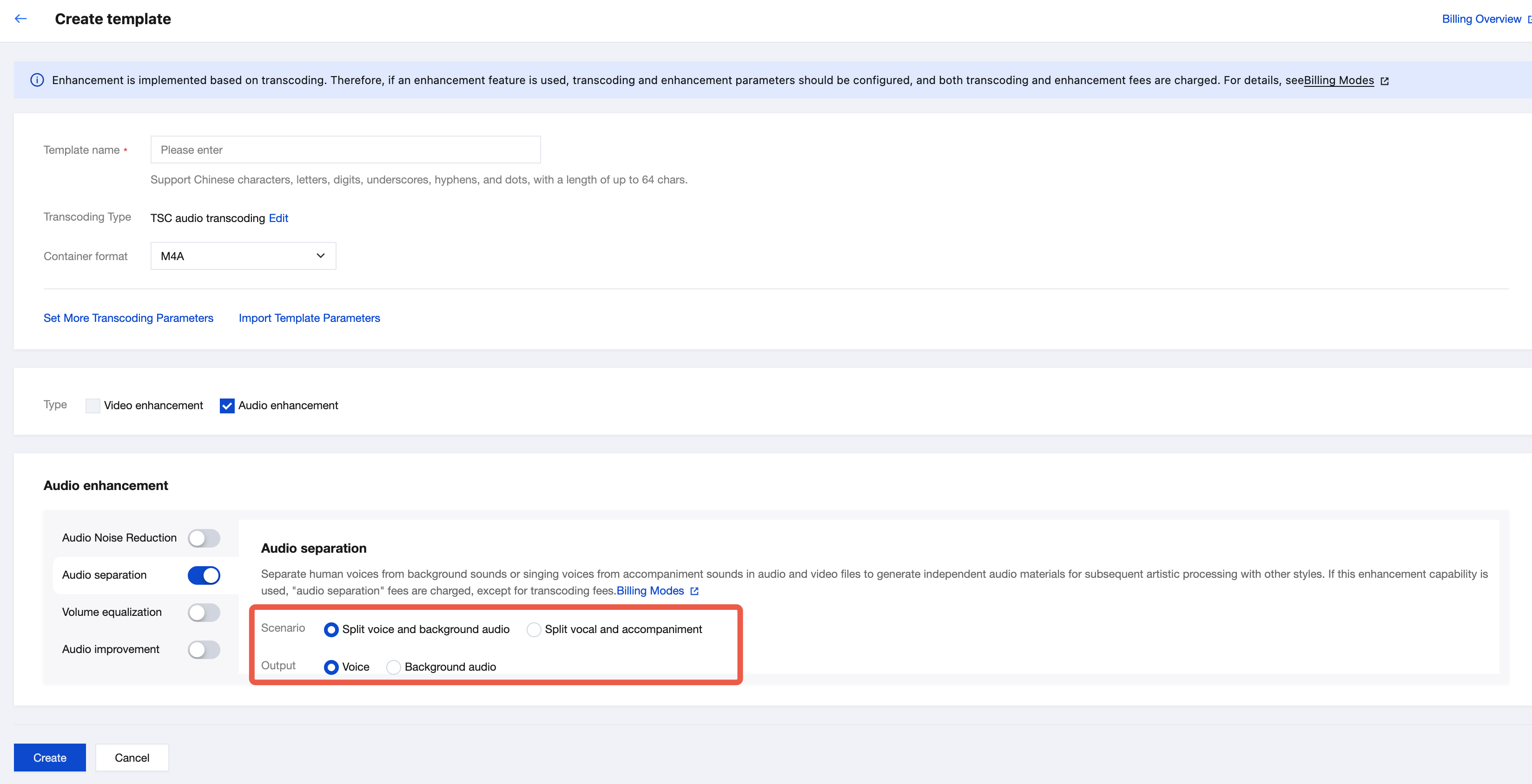 Audio separation is implemented based on transcoding. Therefore, initiating an audio separation task incurs two separate charges: "Audio Separation" plus either "Standard Transcoding" or "Top Speed Codec Transcoding" (which can be selected as preferred).