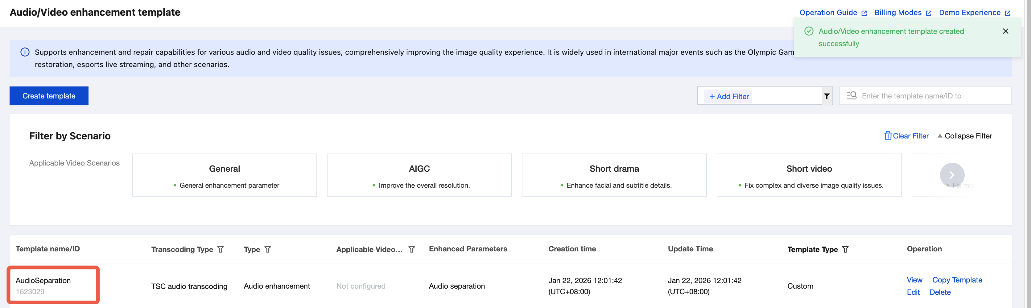 Vocal/Background Separation | Separates vocals from background audio in media files, allowing selective retention of either component. | Enhancing speech recognition accuracy Video dubbing replacement | Charges apply for "Audio Separation" services. For detailed pricing, please refer to the Billing Documentation. |